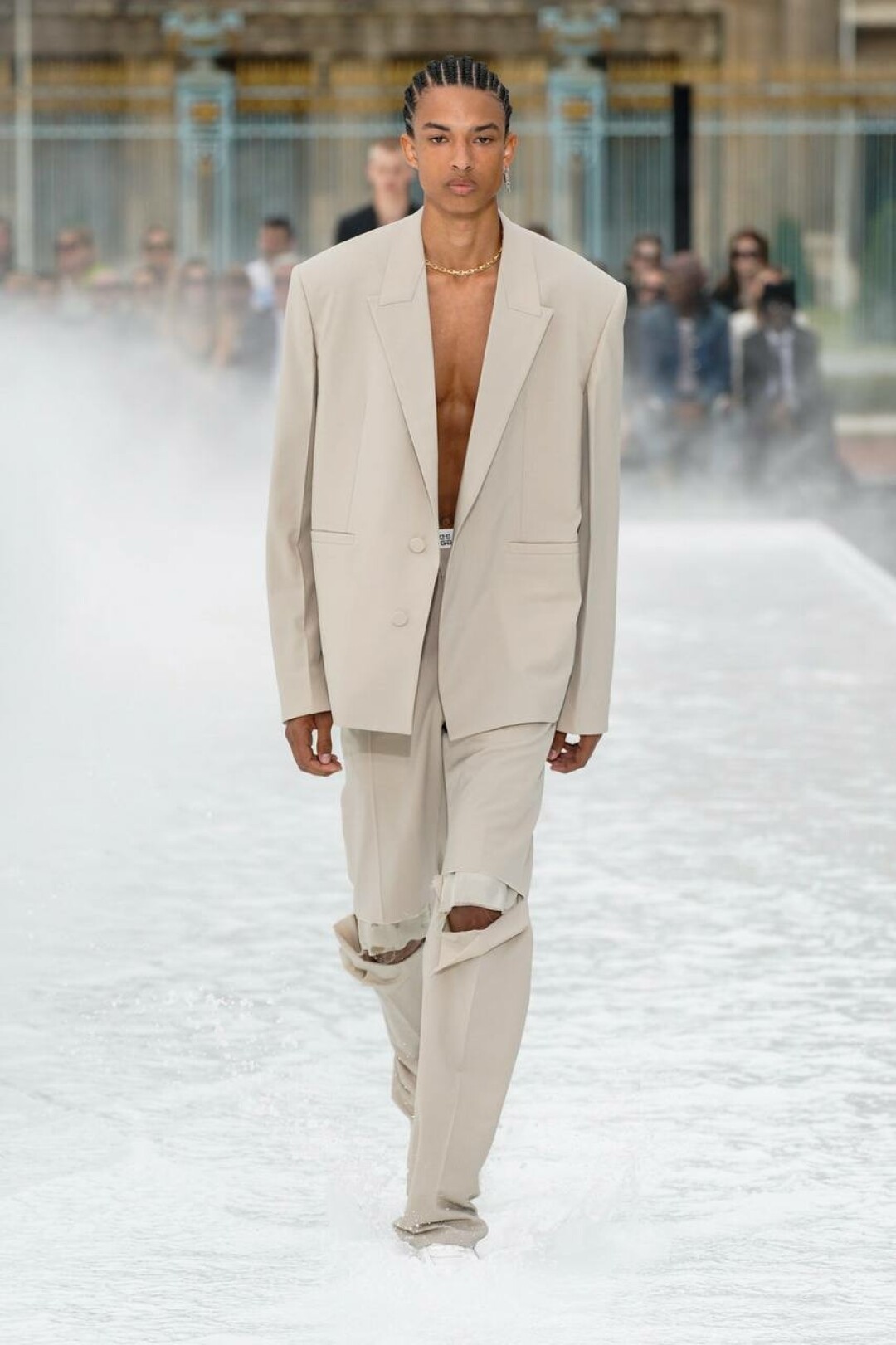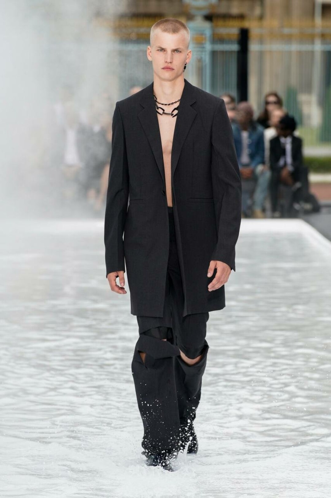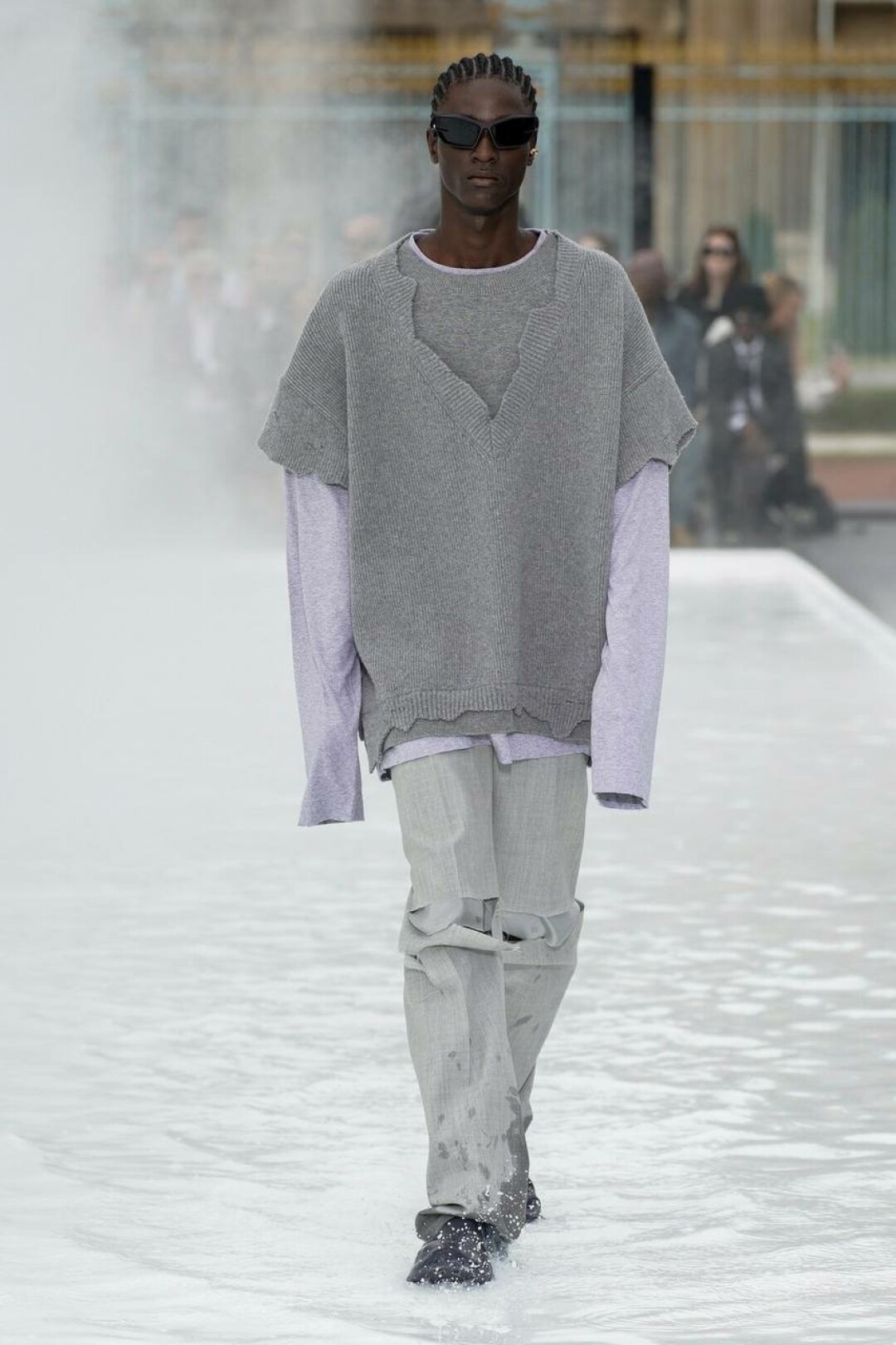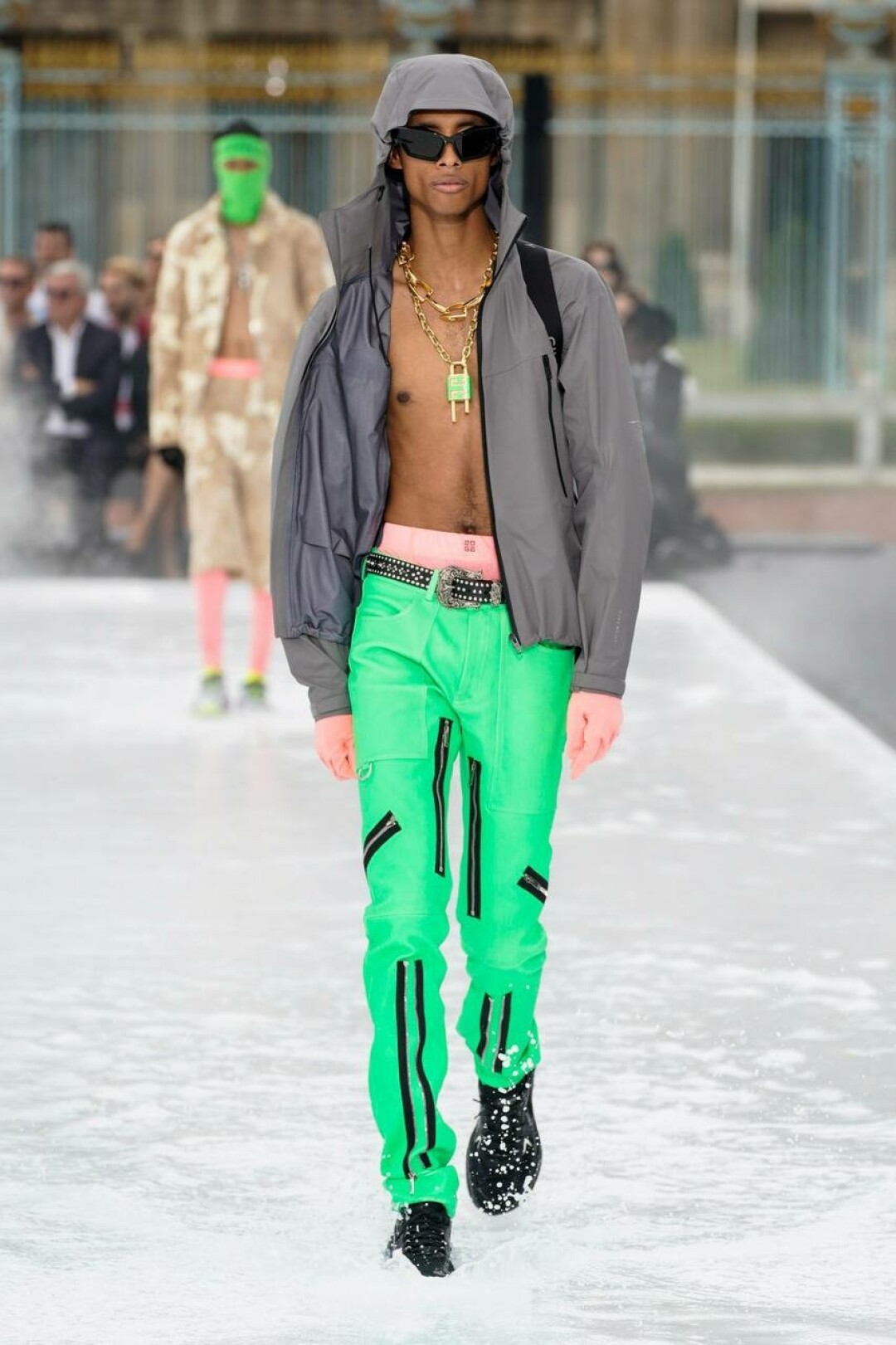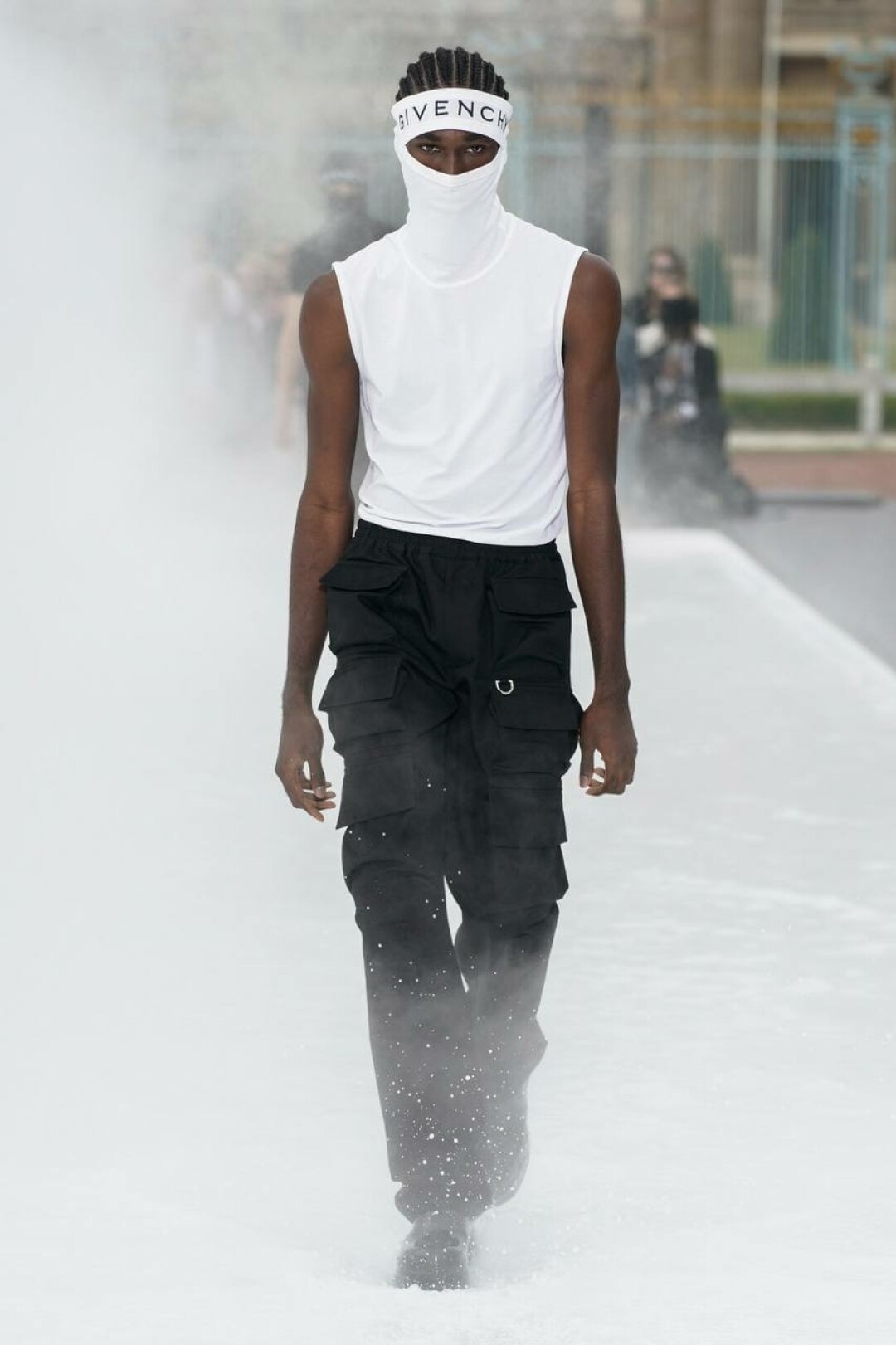 В Париже идет мужская Неделя моды, на которой новую коллекцию представил модный дом Givenchy. Показ бренда прошел в саду военного училища, а подиум был залит водой. По нему ходили модели в резиновых ботинках, балаклавах и спортивных костюмах неоновых цветов: салатового, розового, персикового. Большинство вещей и головные уборы украсил логотип Givenchy..