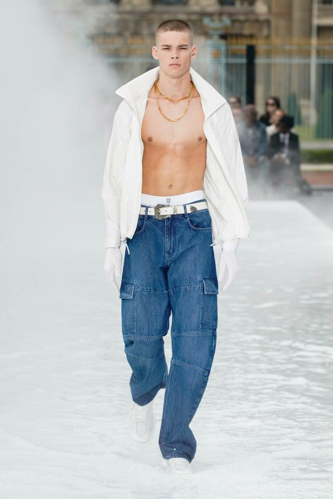 Также креативный директор модного дома Мэттью Уильямс показал свой вариант трендовых брюк карго, шорты из денима и джинсы на низкой посадке, ветровки, костюмы, толстовки, прямые пальто и брюки с дырками на коленях. Образы дополнили солнцезащитные очки, золотые цепи и колье из жемчуга. Не обошлось и без главного стилистического приема последнего времени — выглядывающей резинки от нижнего белья.
