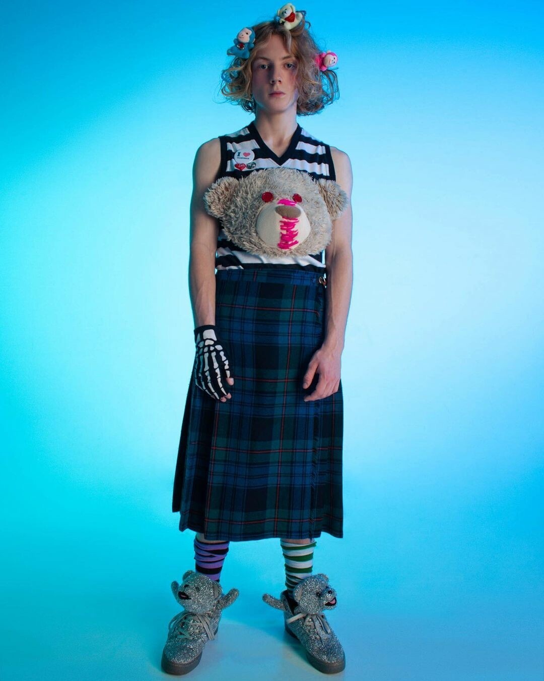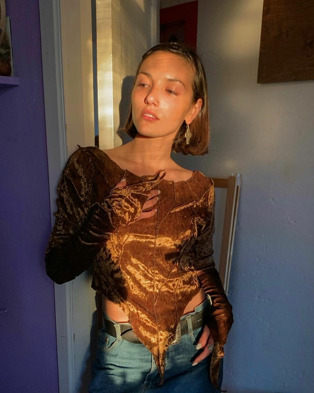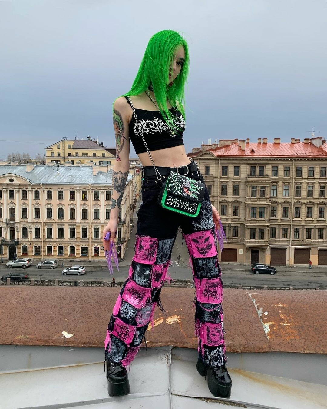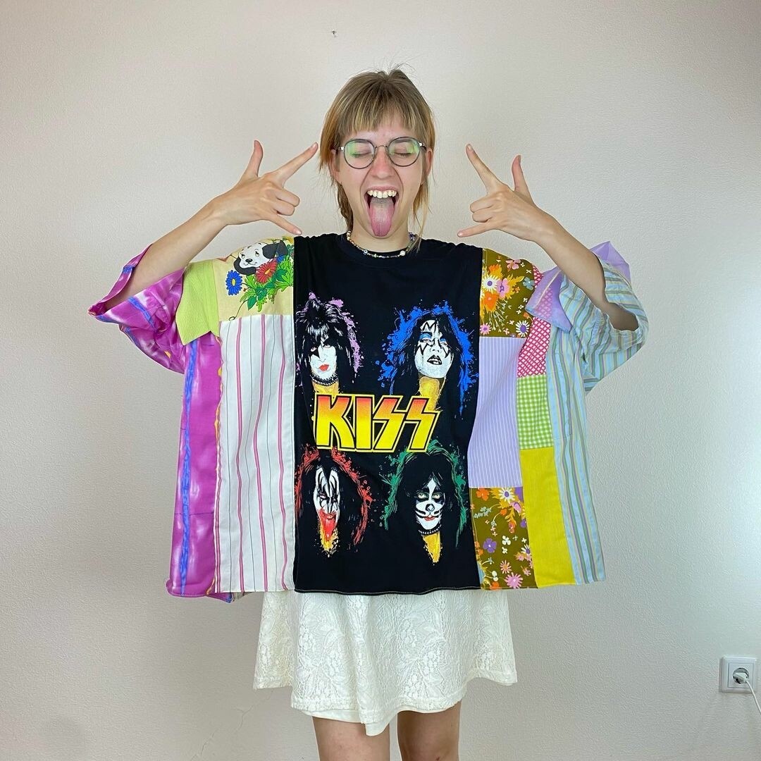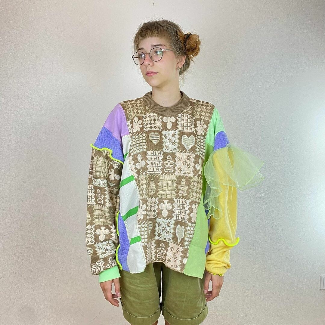 Петербурженка Женя собирает новые свитеры и рубашки, как конструктор, из старых же свитеров, рубашек и футболок. Получается жизнерадостно, артово и с молодежным вайбом. Работает она с вещами, демонстрирующими поп-культурные феномены («Сумерки», «Гарри Поттер», «Очень странные дела») и субкультурные явления («Сектор газа», Blink-182). Кастом-мейкер умудряется сочетать классические и цветочные принты, оборки, клетку и вязаные элементы в одной вещи, а заодно сама показывает, как их носить.