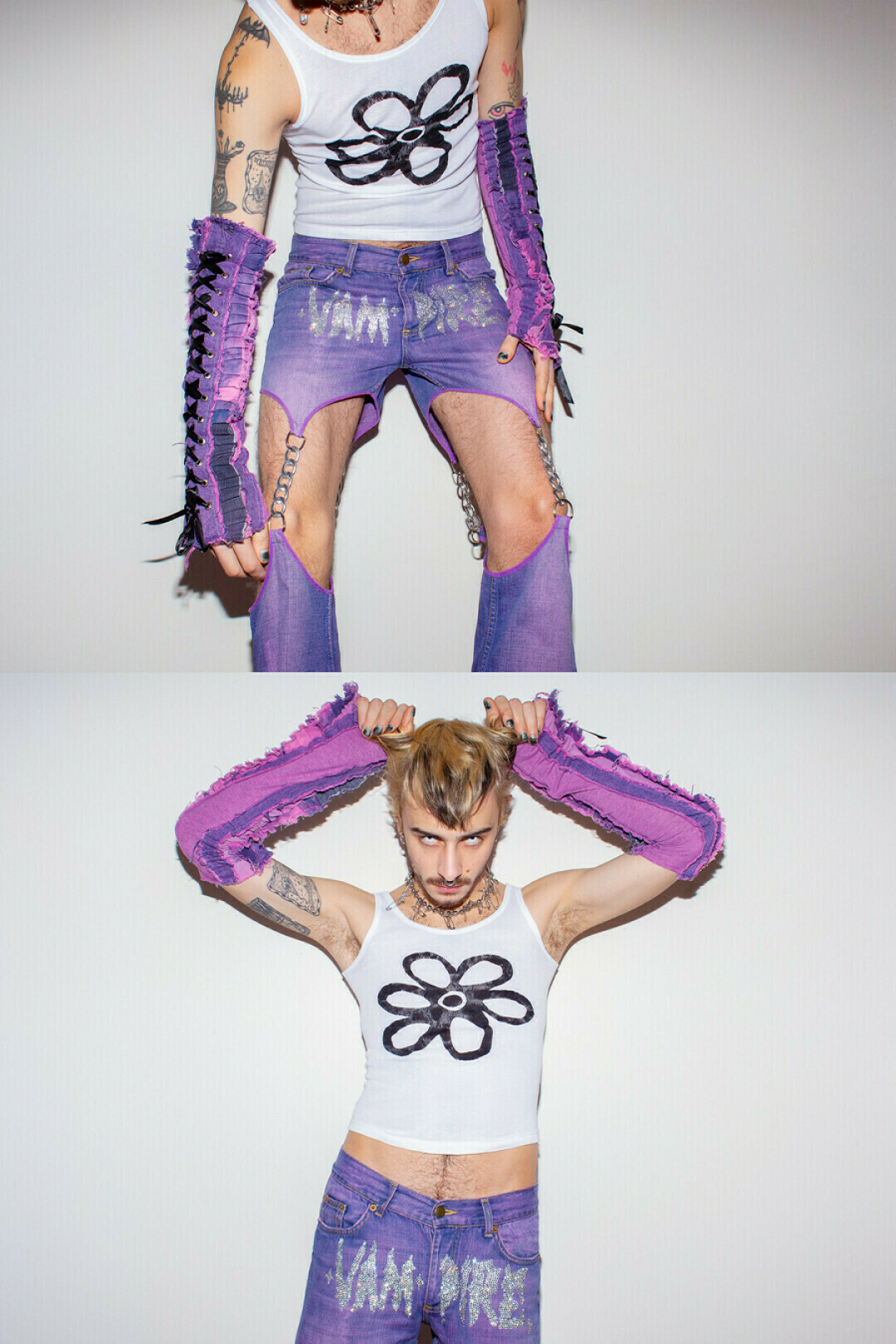 Ксения Черемнова и Дима Вишнеев — лауреаты премии «ТОП50. Самые знаменитые люди Петербурга» — 2022 — придумали кастом-бренд Manicure Vampire. И это панк-кутюр: как если Мартин Маржела едет на Уделку, находит там пиджак и переделывает его для Soda Luv. Одежда Manicure Vampire — это wearable art: к одежде пришивают фотографии и детские игрушки, используют вышивку, пэчворк, роспись. Каждая вещь создана вручную по принципу RRR — reduce, reuse, recycle.