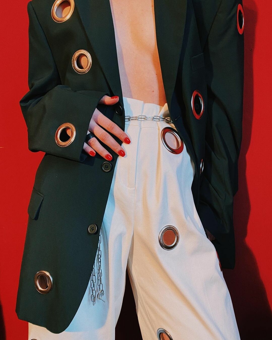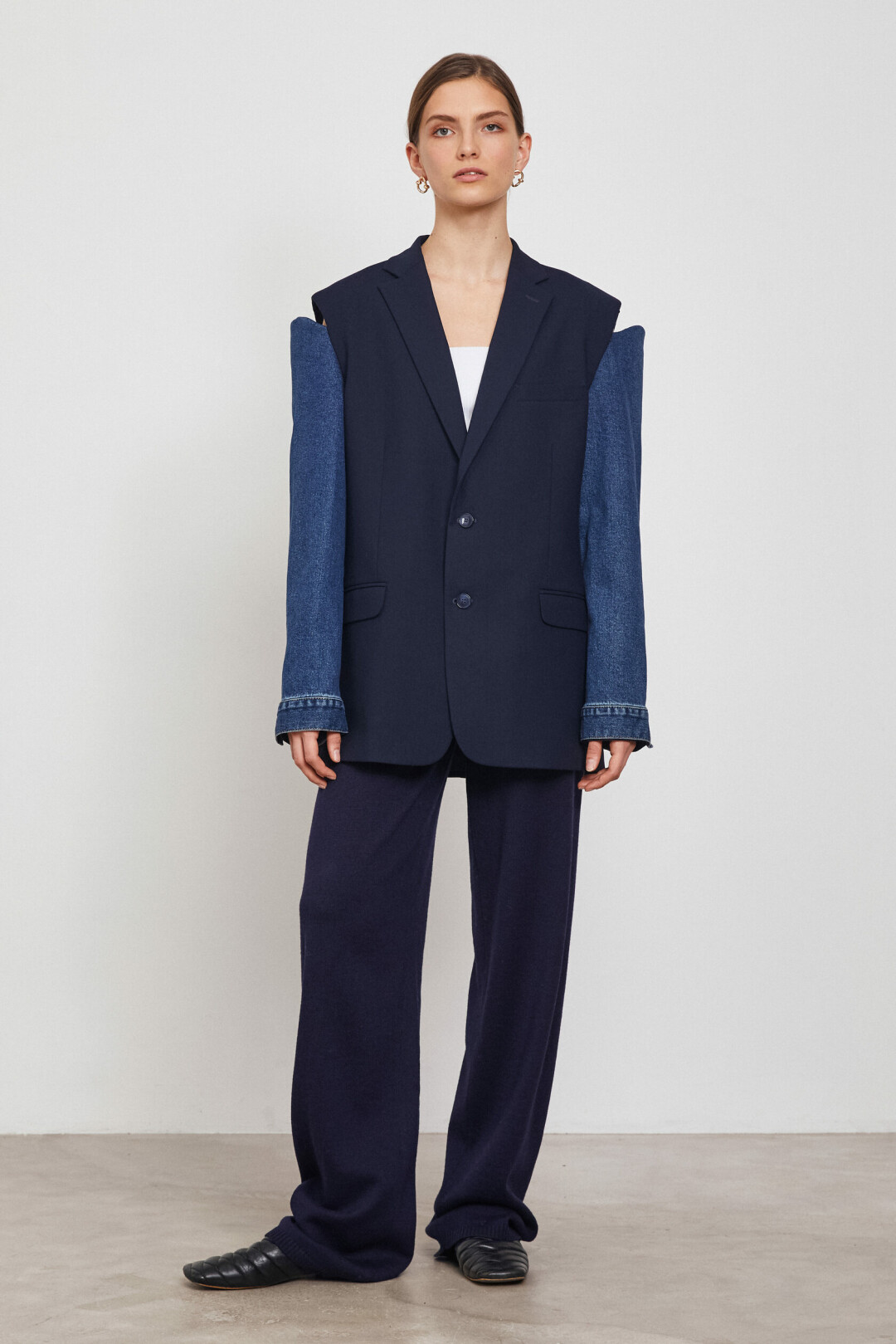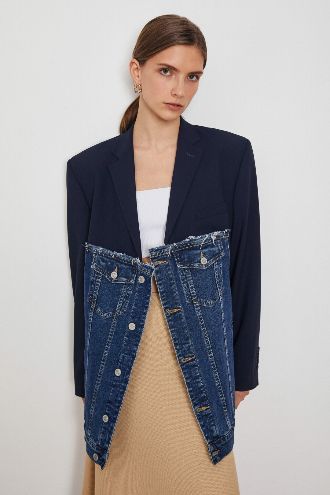 В Jeanskeat тоже сосредоточились на жакетах. За основу взяли классический пиджак, а за кастомизацию и апсайкл отвечают старые вещи из денима. Именно их создатели марки превращают в отделку новых вещей, используя части и фрагменты курток, джинсов и рубашек. Можно принести (или отправить) свою любимую джинсовую вещь на переделку и таким образом продлить ей жизнь.