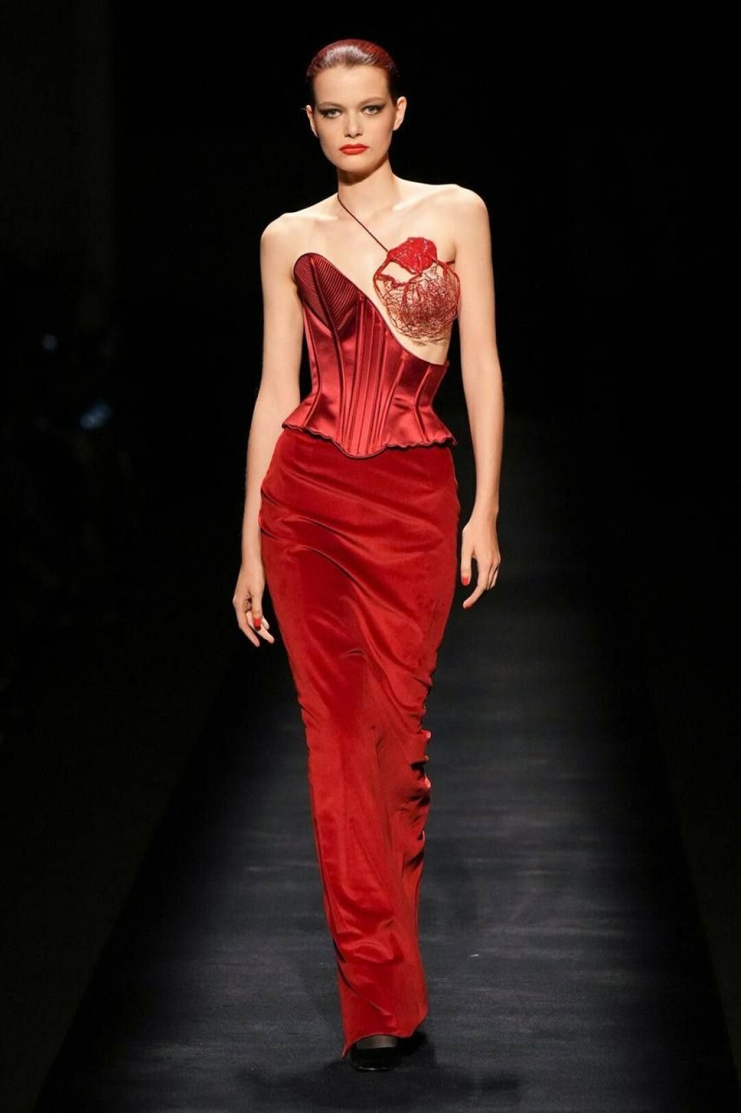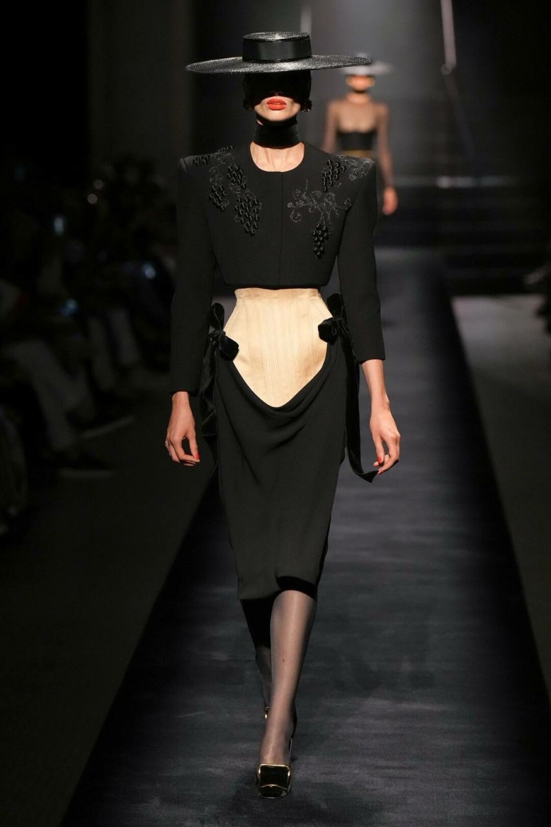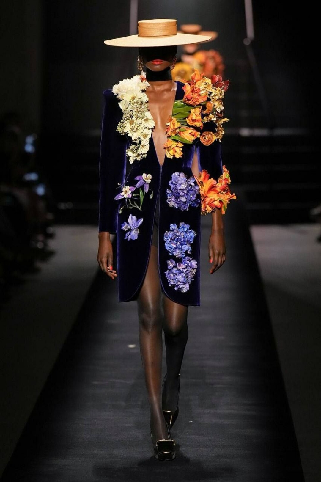 Креативный директор Schiaparelli Дэниел Роузберри в этот раз меньше внимания уделили золотым элементам и переключился на цветы. Они украсили жакеты, сумки, превратились в бра. Главными деталями кутюрной коллекции стали широкополые шляпы: от сдержанных вариаций канотье до украшенных перьями и птицами, и корсеты, открывающие грудь. Не обошлось и и без обращения к телесности — на этот за нее отвечали сердца на платьях и в виде украшений.