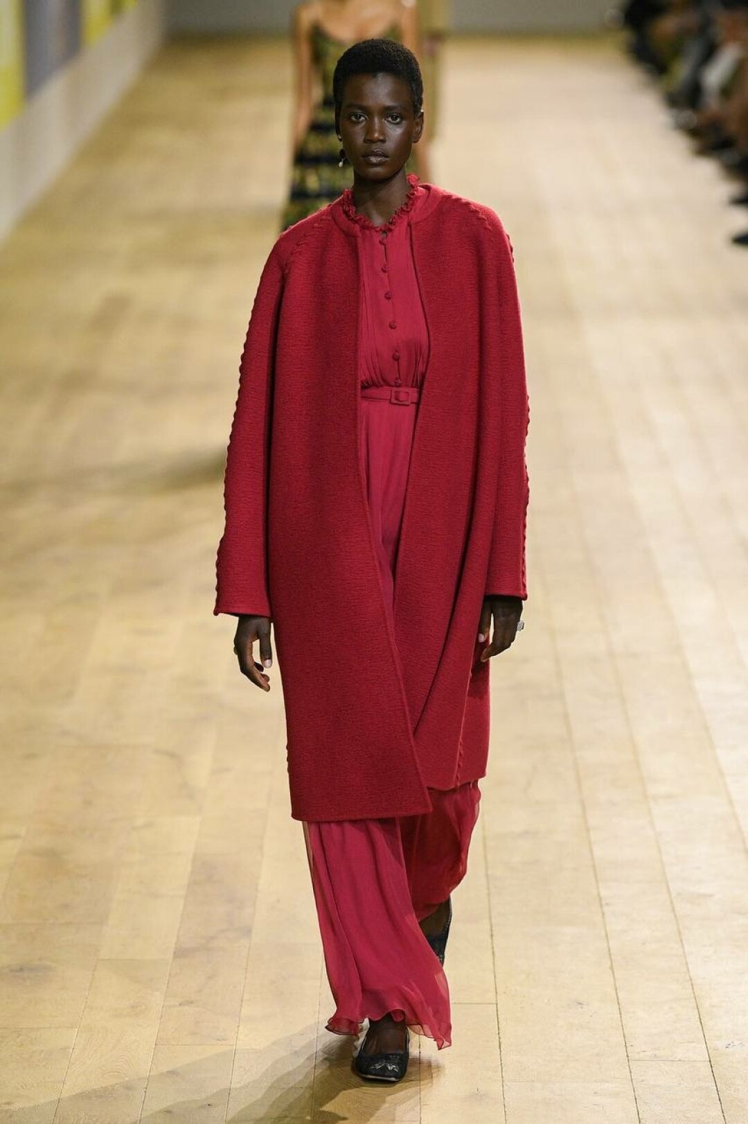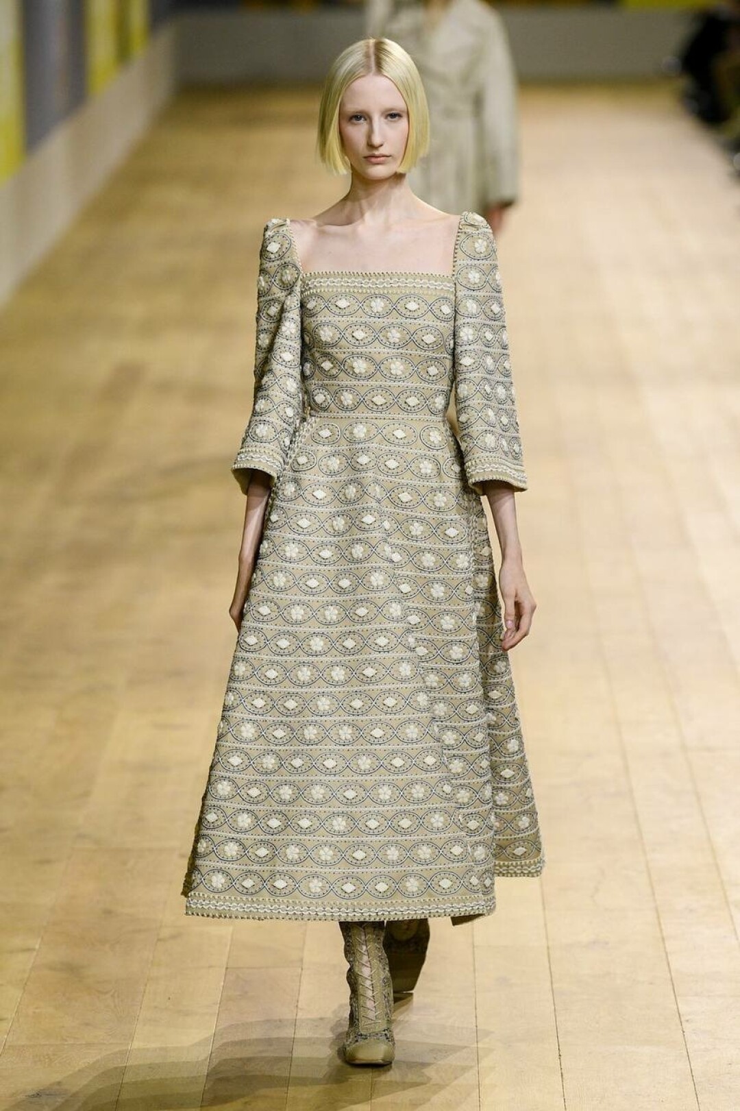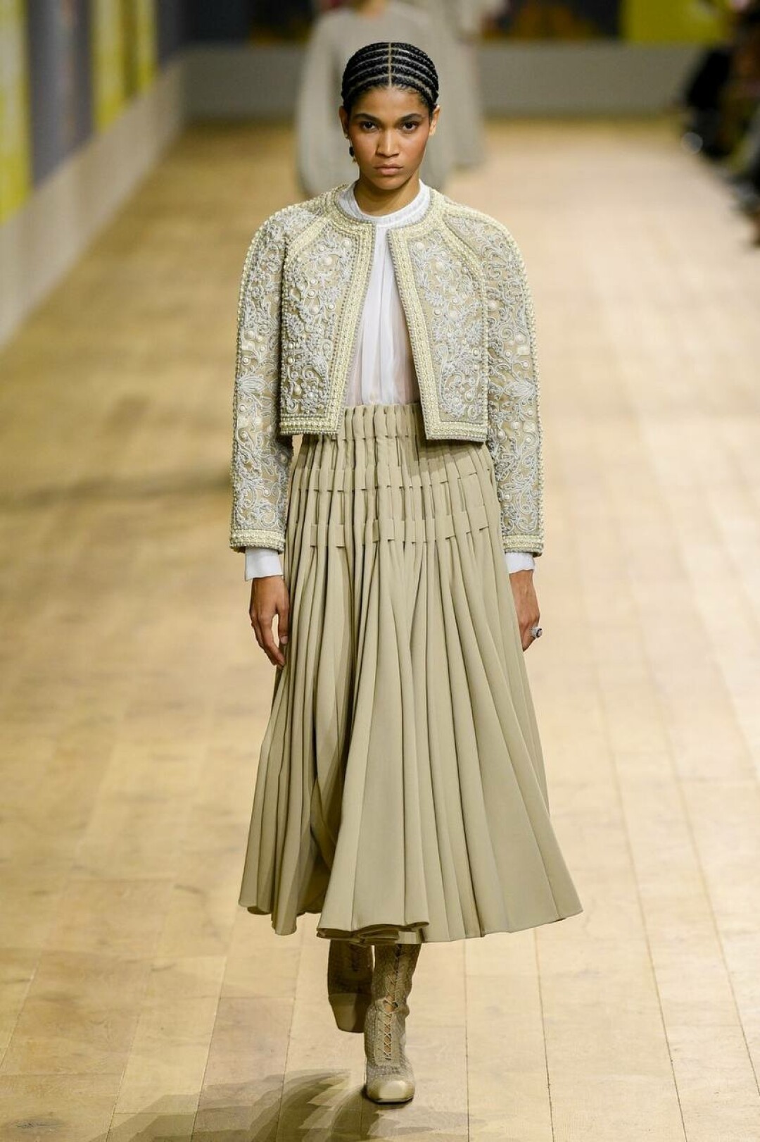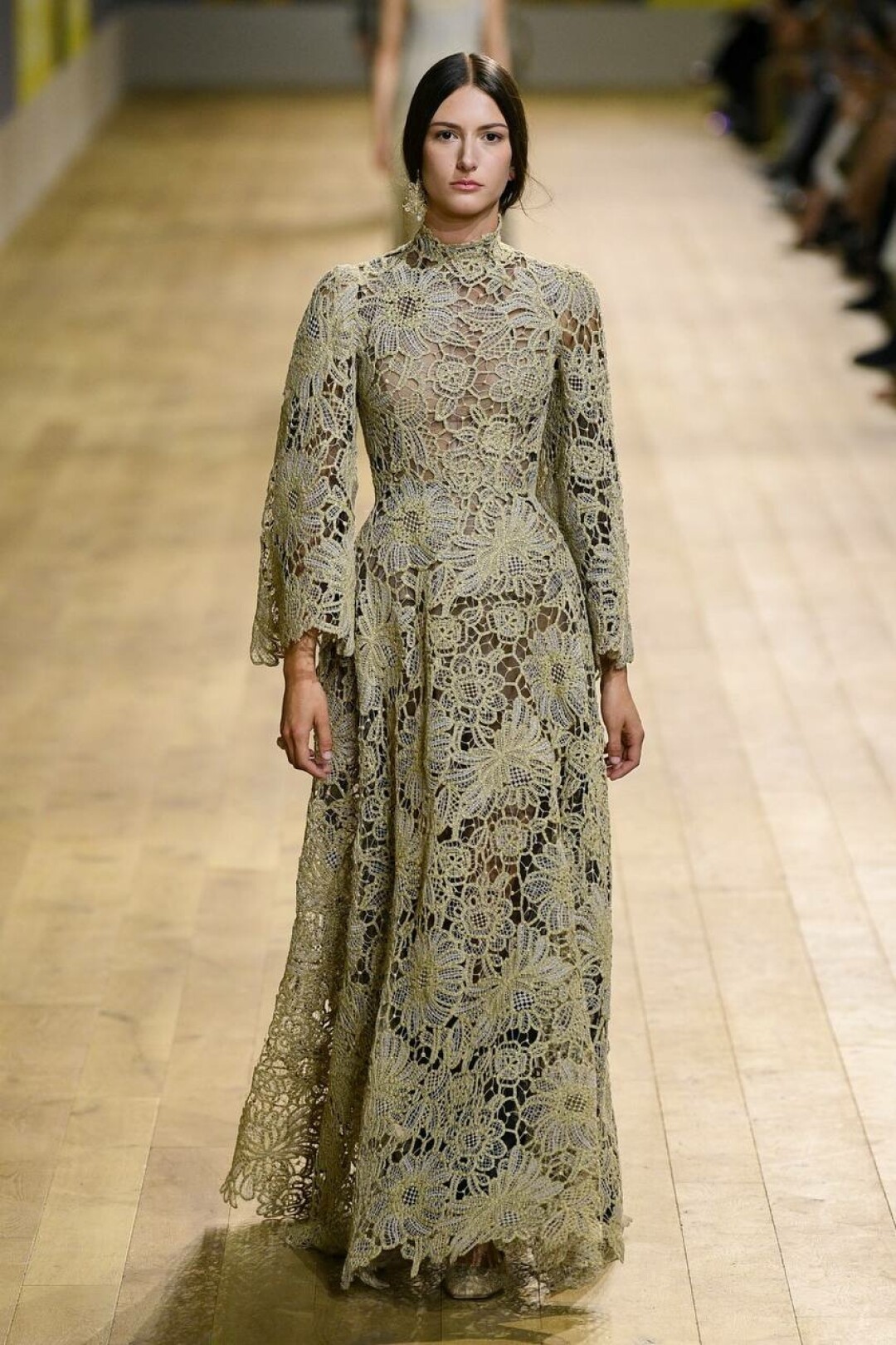 На подиуме Мария Грация Кьюри показала шифоновые летящие платья, расшитые жакеты, сарафаны, платья и пальто, транслирующие культуру и народный код того или иного мастера, работающего над коллекцией. Особого внимания заслуживает ручная вышивка, украсившая почти каждый образ.