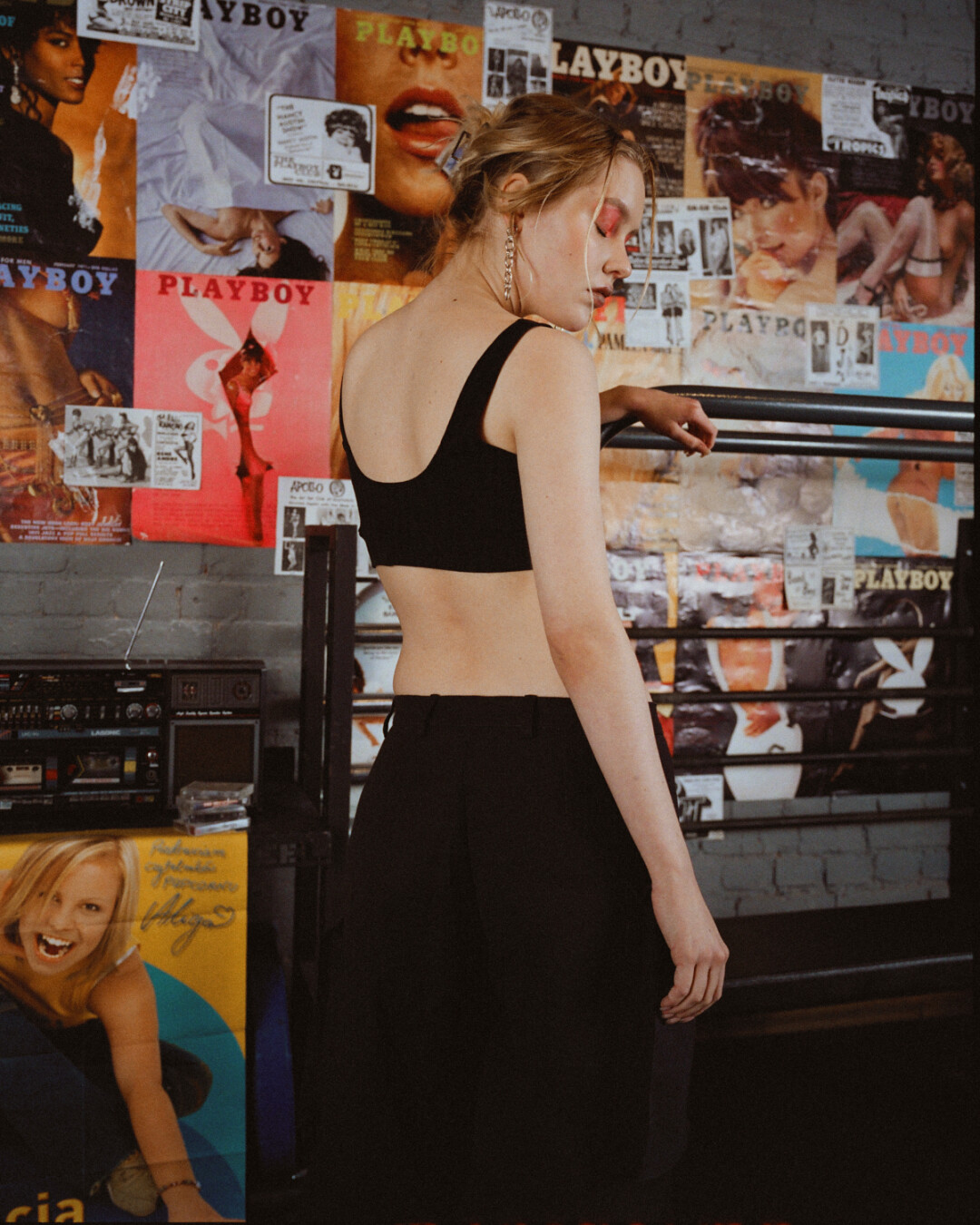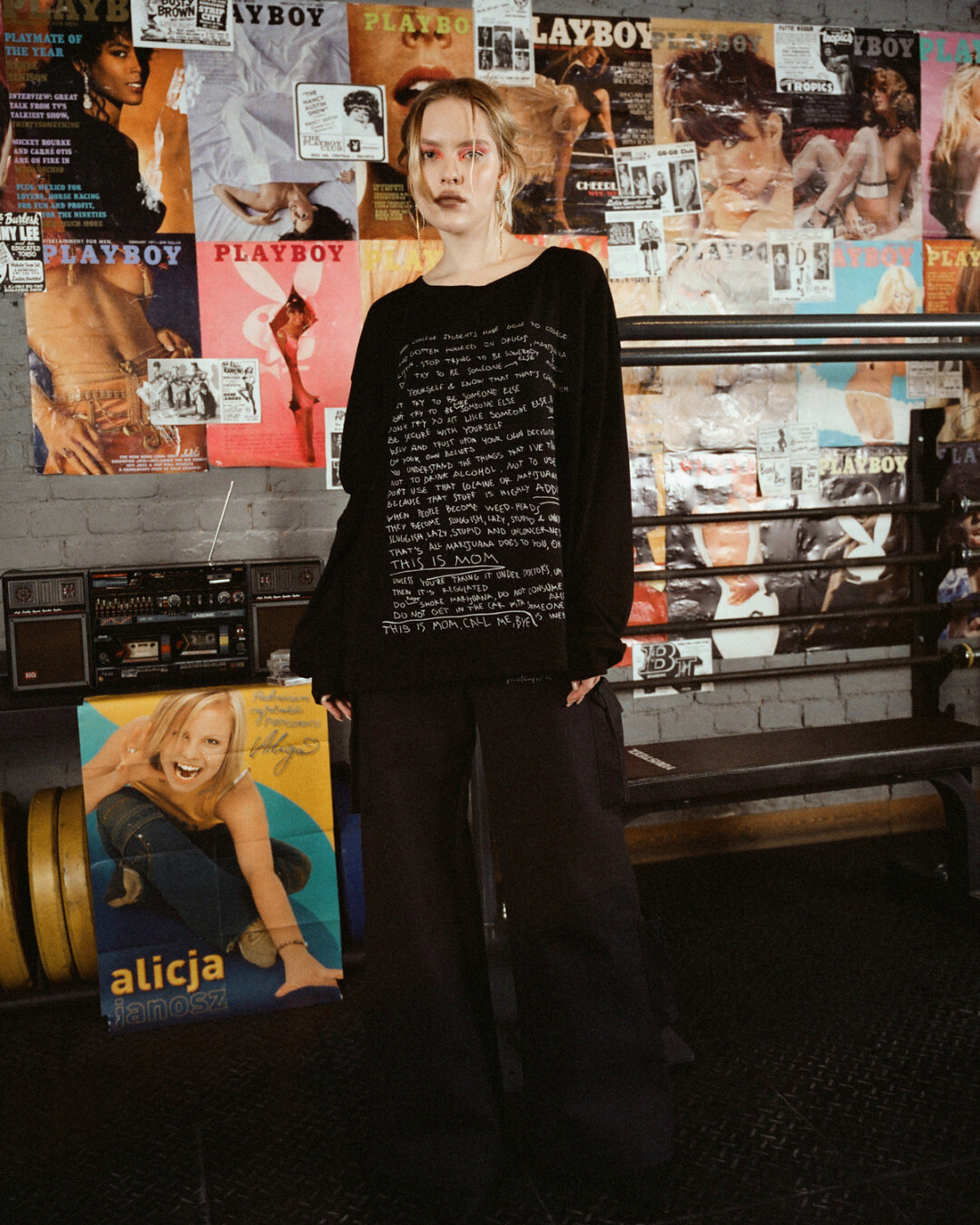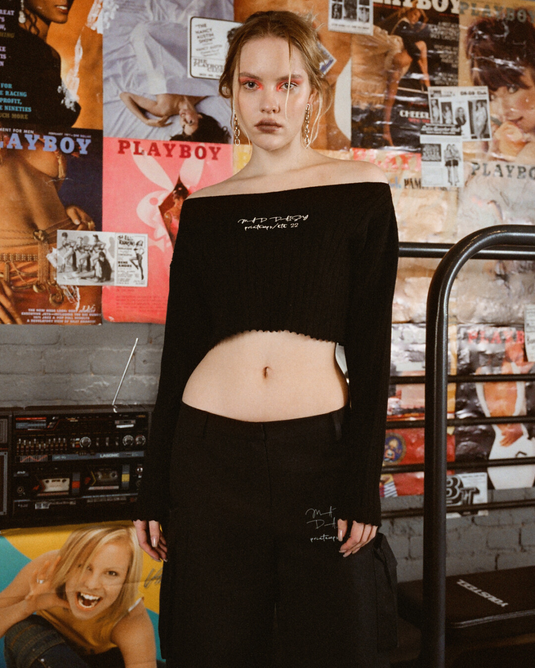 Тему нулевых продолжают англоязычные текстовые принты. Например, надпись «Общество анонимных сексоголиков» — она отсылает к транслированию секса через гламурный стиль и R&B. О том, что от каждой аддикции кто-то кого-то пытается уберечь, напоминает перенесенный на лонгслив текст интро «Be Yourself» к альбому Blonde Фрэнка Оушена. В новую коллекцию Mad Daisy вошли худи, бомбер, лонгсливы, брюки карго, шорты, топы, жакеты и боди.