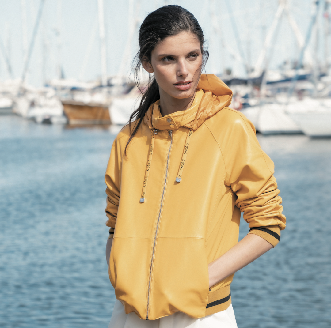 Ярко-желтый кожаный бомбер DIEGO M идеален для закрытия яхтенного сезона: плотная резинка снизу и на рукавах и капюшон превращают его в отличную защиту от пронизывающего ветра Финского залива. Кстати, в городских условиях он так же хорош.