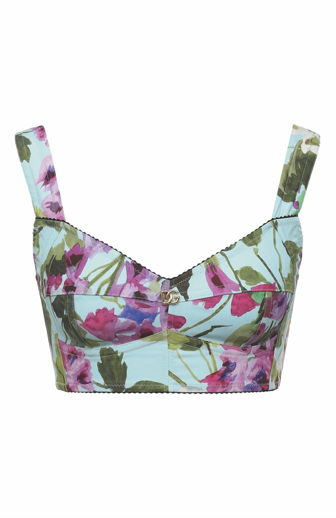 Хлопковый бра-топ с цветочным принтом Dolce & Gabbana превратится из пляжного атрибута в городской, если носить его с голубыми джинсами, юбкой-карандашом и белой рубашкой, не застегнутой, а завязанной узлом.
