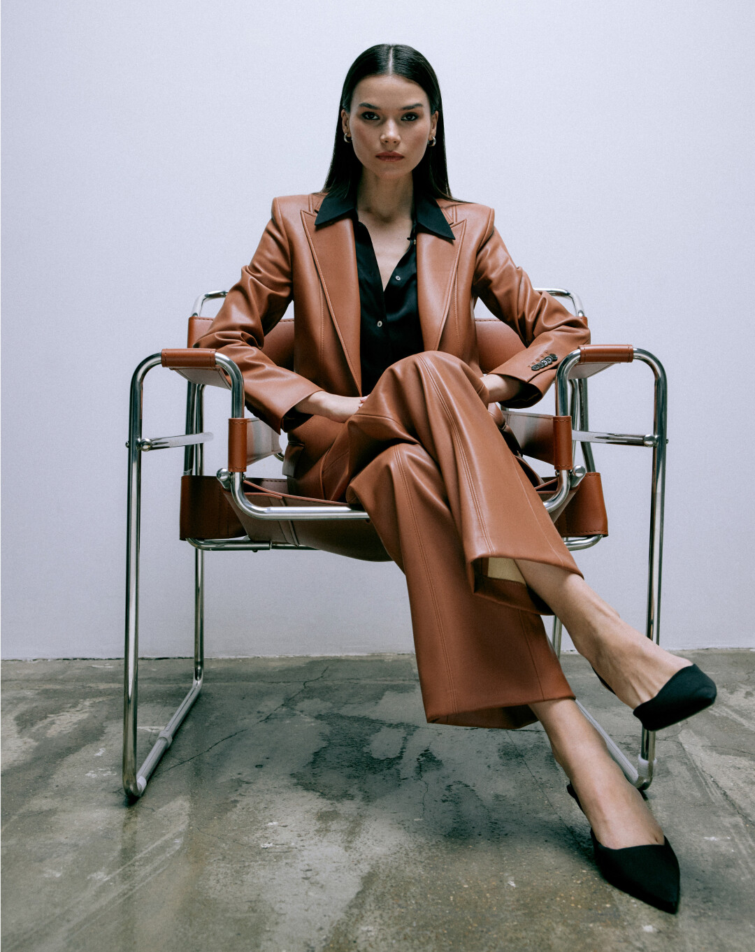 Если бы архитектор-минималист Корбюзье вдруг решил сделать костюм, у него точно получилось бы что-то похожее на новый сезон Charuel — строгий пиджак с острыми лацканами и прямые брюки из светло-коричневой эко-кожи.