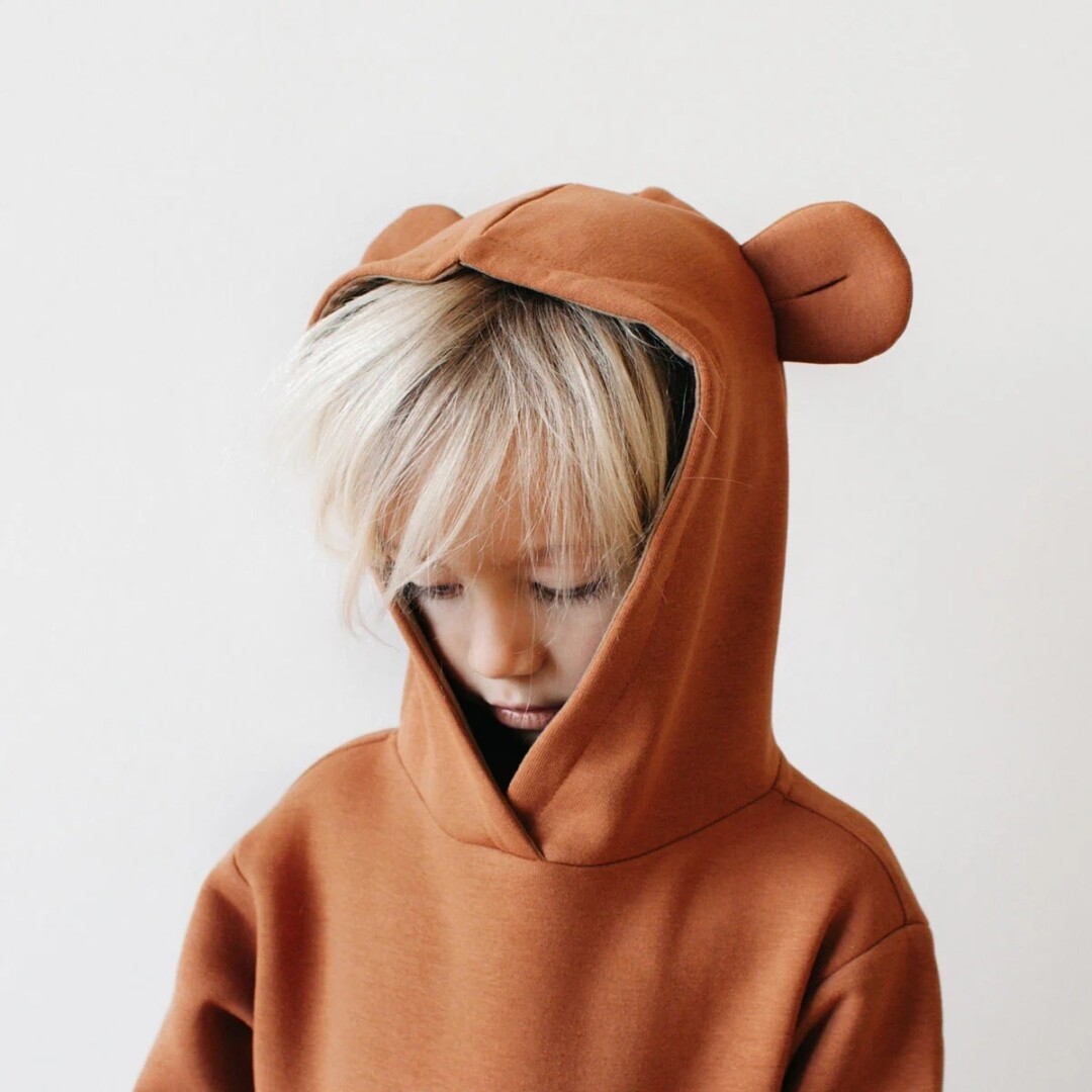 Петербургская марка Little Acorns мыслит локально: худи выходят теплые, с начесом, капюшон сконструирован так, что закрывает шею – спасибо дизайнерам за теплых ноябрьских детей. Но главное: у него ушки. Идеально для мышиной возни!