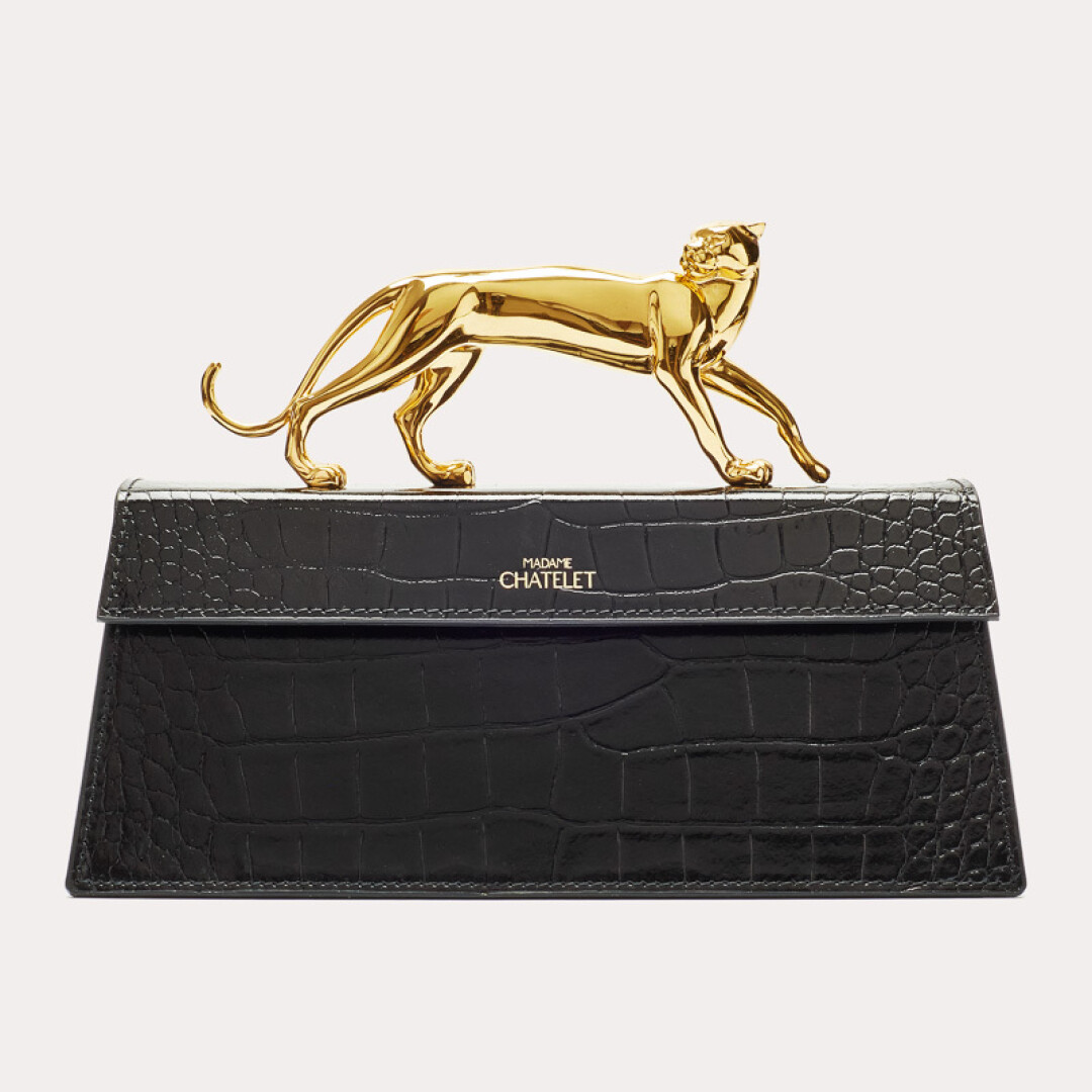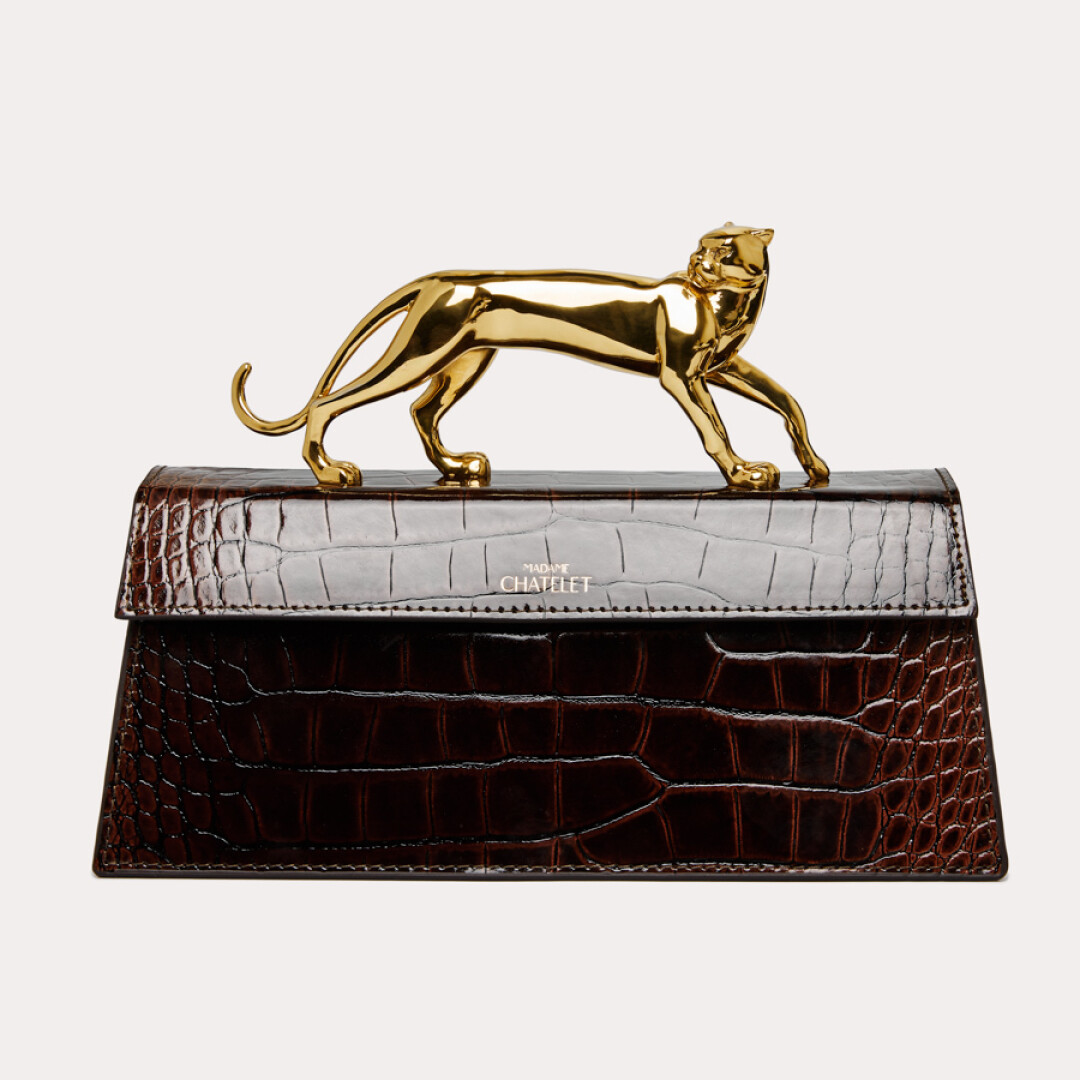 Сумка-тотем из лакированной кожи с тиснением под крокодила с позолоченной ручкой-пантерой — едва ли не самый узнаваемый аксессуар отечественного производства. С Fatal от Madame Chatelet ходят Наталья Водянова, Алеся Кафельникова и Ксения Собчак. Вещи с актуальным флером нулевых изготавливаются полностью вручную в Москве, там же льют пантер, остальную фурнитуру используют итальянскую. Сумка появилась осенью 2021 года (на разработку ушло три месяца), а сейчас ее можно получить только по предзаказу (время ожидания — от двух недель). Бренд запустили три лучших друга: креативный дирек- тор Вячеслав Хрюков, дизайнер Максим Киревичев и директор по маркетингу Грета Джанбарянц. Название Madame Chatelet они придумали, отталкиваясь от того, что мадам — их клиент, а Шатле — станция метро в самом сердце Парижа.