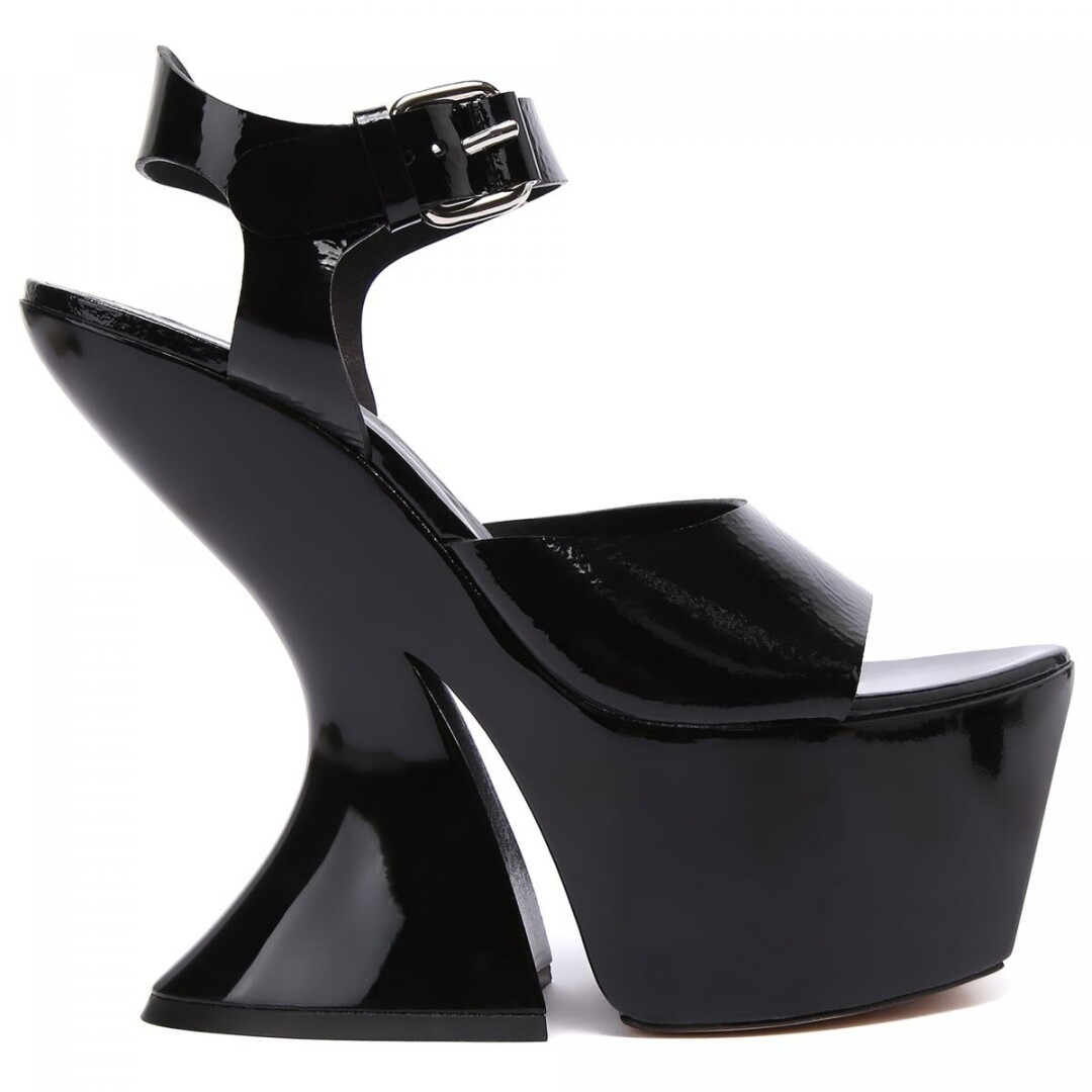 Бренд Casadei (авторы идеальной колодки!) тоже сделали свою пару для NO ONE — черные лаковые босоножки на экстремальной платформе с флером двухтысячных.
