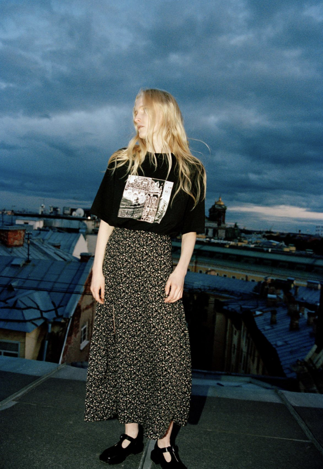 Униформу для июньских прогулок по крышам нашли в коллабе YOU x Академия Штиглица. Коллекция посвящена белым ночам, а принты придуманы и созданы молодой художницей и студенткой Академии Полиной Марковой. Первая серия принтов “Дождь и слезы в Петербурге” – нежный и меланхоличный взгляд на город через фотопленку. Вторая, изображающая Кариатиды и Атланты, вышла более яркой и экспрессивной.