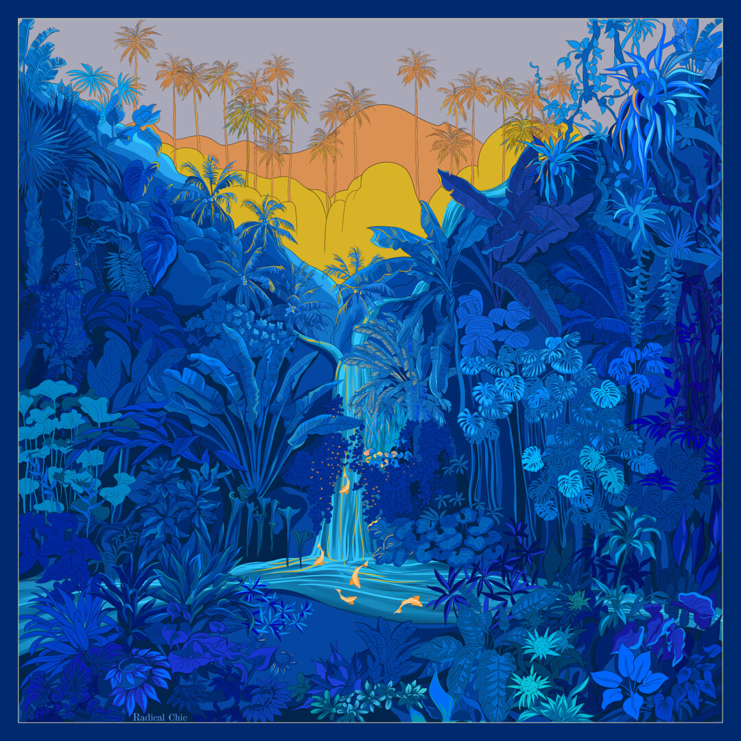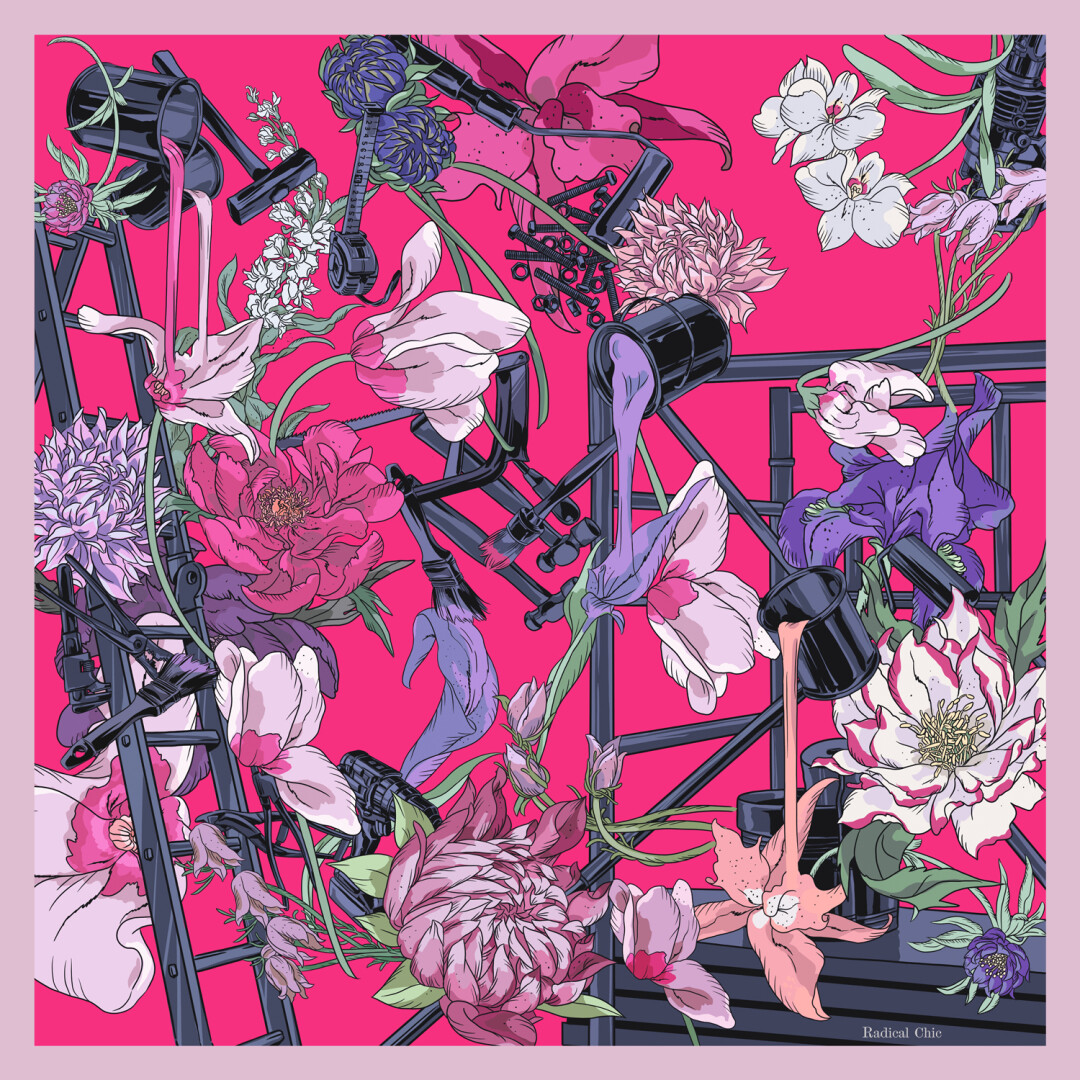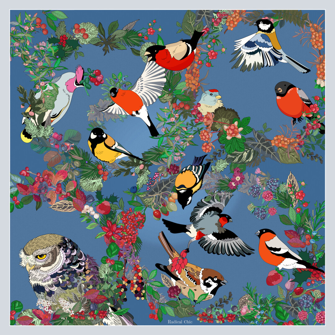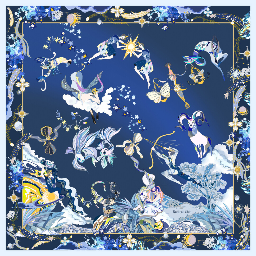Картины на стыке творчества нейросетей и палитры Альфонса Мухи — все на шелковых платках из новой коллекции Radical Chic, объединяющей наивкор и сказочный анимализм (кто ты сегодня: ромкорный пес, астрономический овен или снегирь в полете?). Носим вместо вязаного чепчика на манер косынки Dolce & Gabbane либо следуем советам Ushatava, превращая платок в юбку с разрезом (остромодная мидакси!).
