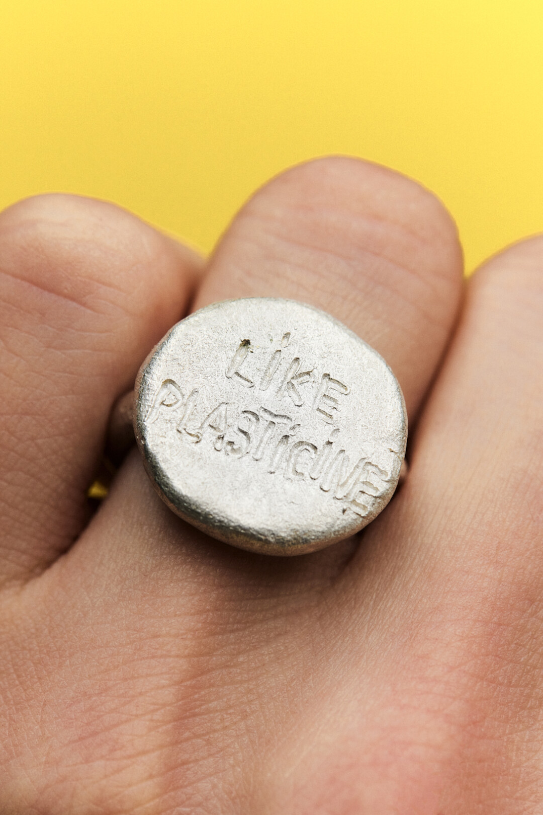 Кольцо-гусеница, тринкет-утенок и бабочка с ирокезом (бунт выходного дня): Avgvst в коллаборации с ювелиром Александром Карпинским сваял из пластилина (в лучших традициях Джонатана Андерсона) ироничные фигурки, а затем отлил украшения из серебра с позолотой. Для сохранения "пластилинового" амбьянса все пуссеты и кольца не полируются и не покрываются родием - плюс продаются в коробке с пластилином (по примеру приглашений на сентябрьский показ JW Anderson).