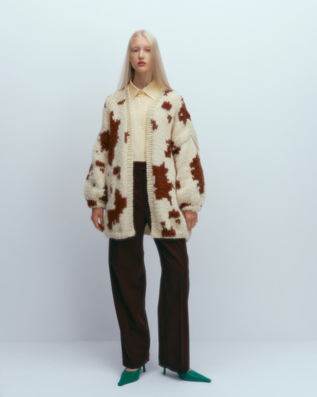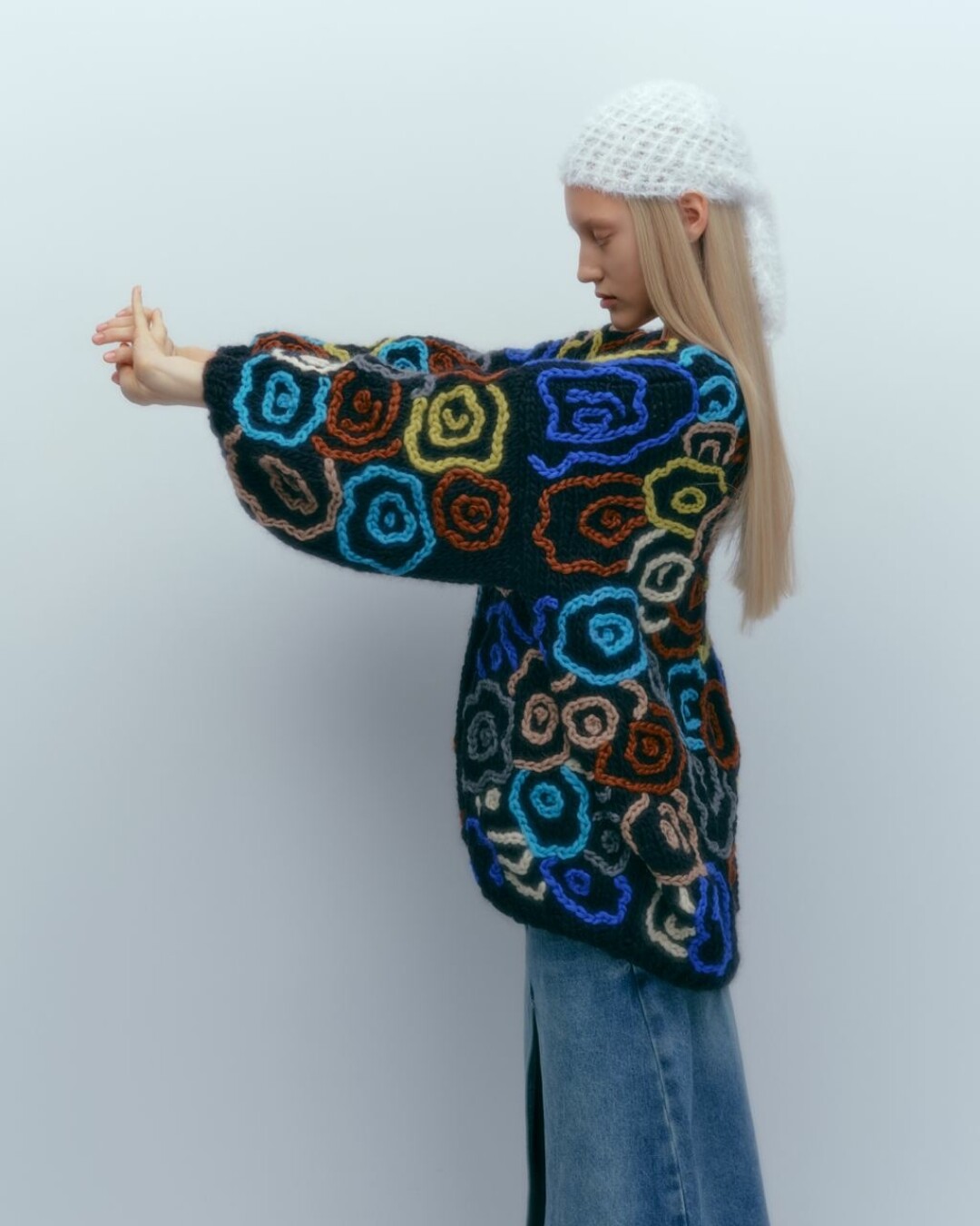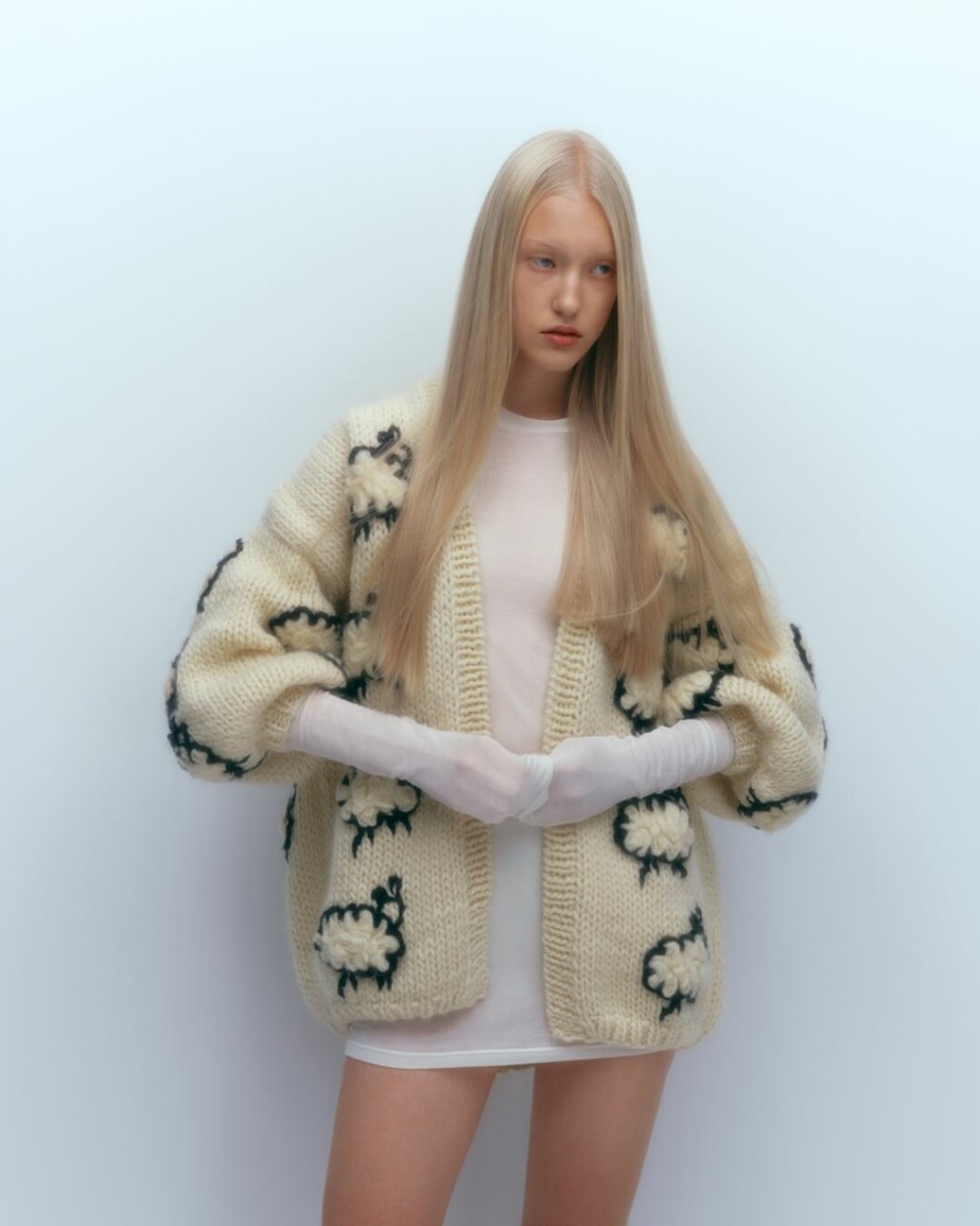 Примеряем свитер принцессы Дианы из новой капсулы Mirstores: красные кардиганы украшены объемными кроше-аппликациями барашков ручной работы. В комплекте с отарой идут кардиганы с пятнами «под коровку» и сюрреалистичными розами с рисунков художницы Сони Делони — стилизуем вместе с полупрозрачными сетчатыми платьями, макси-денимом и кроше-косынками.