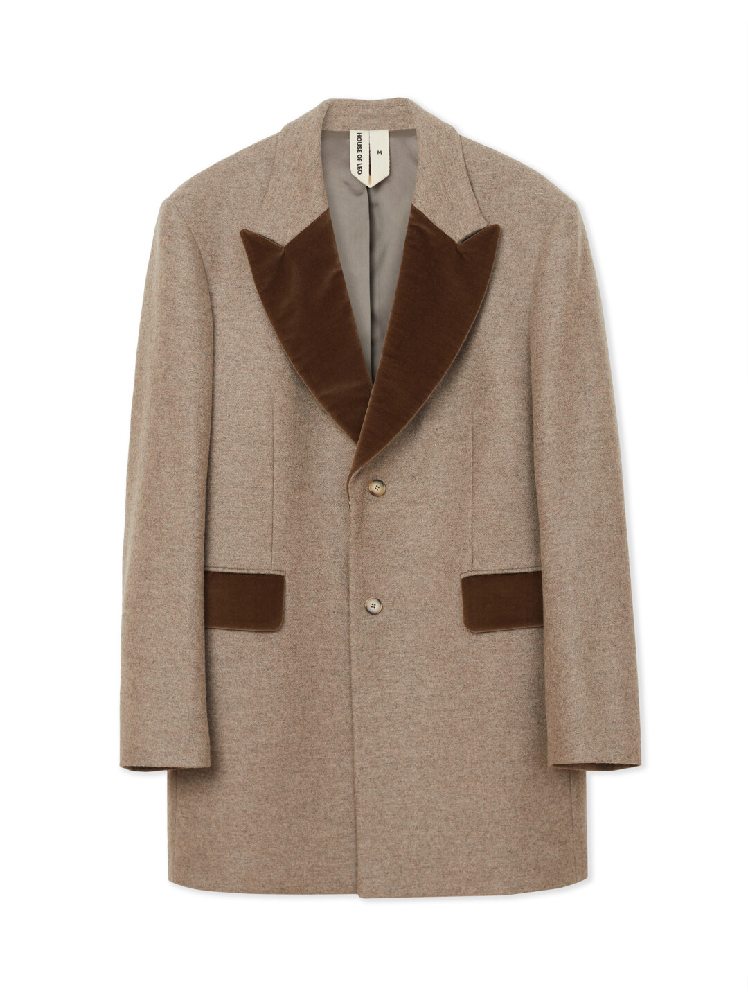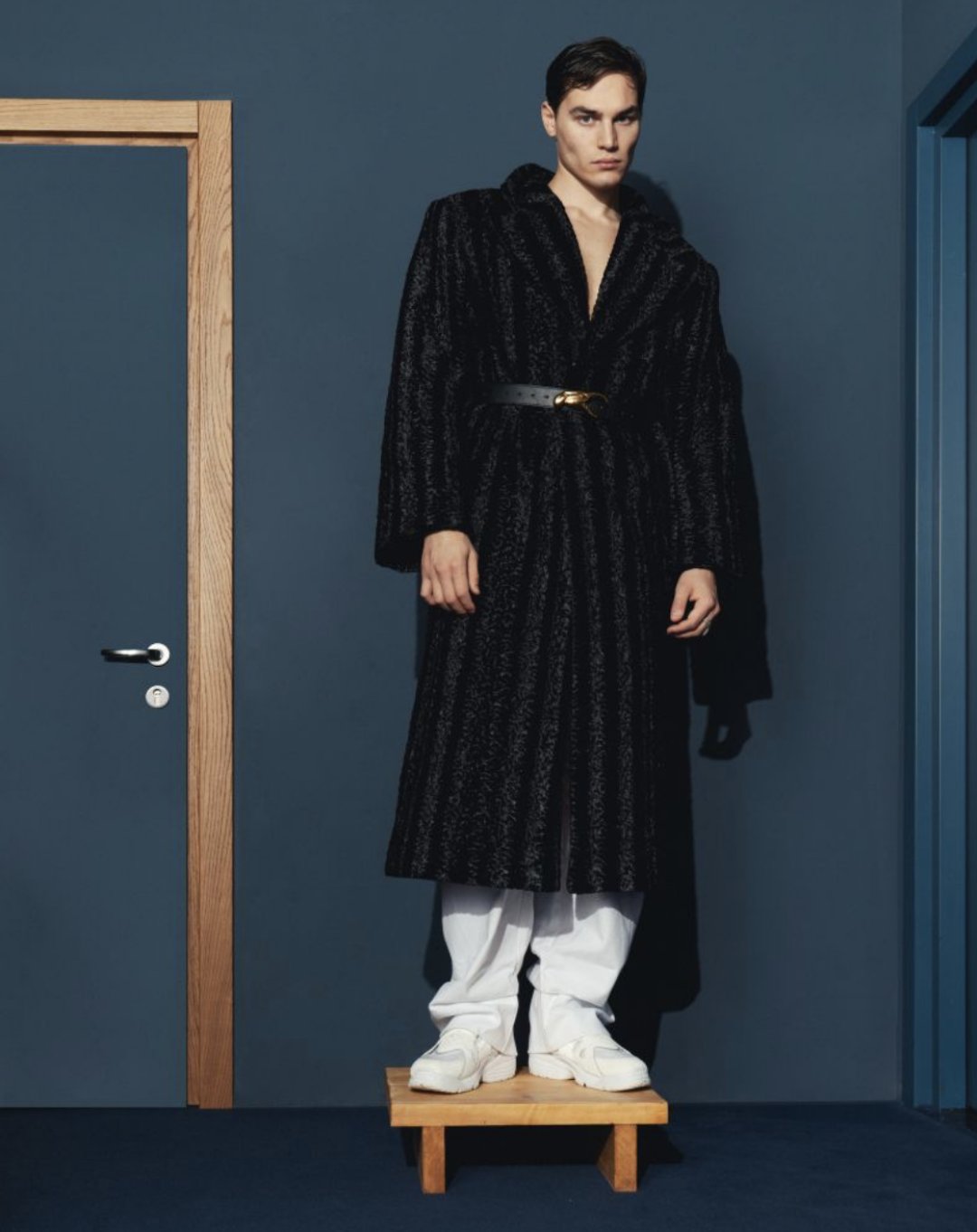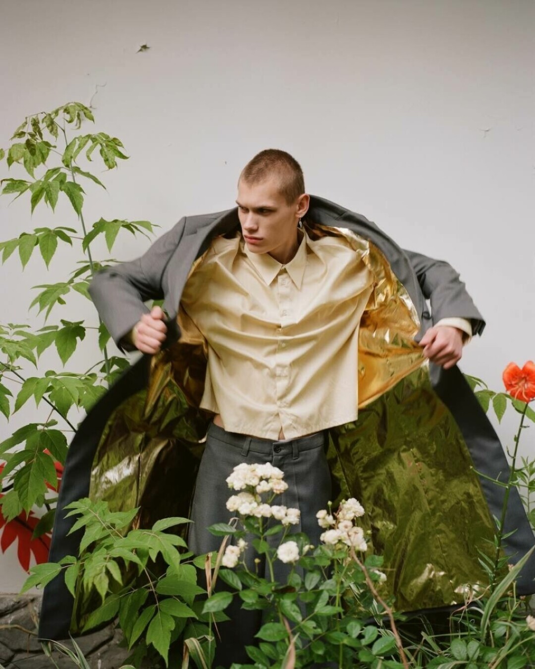 Стратегические пальто-направления мужской линейки: за думкорным двубортным бушлатом идем в Studio Slow, купеческий шик забираем у Chernim Cherno, а золотистый металлик на подкладке — у Walk of Shame. Играем с лацканами по примеру фаундера House of Leo Леонида Алексеева и примеяем амплуа принца Уэльского силами Dries Van Noten.