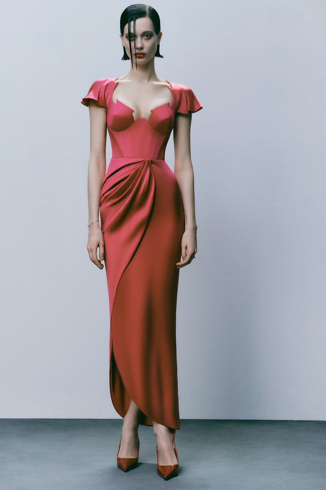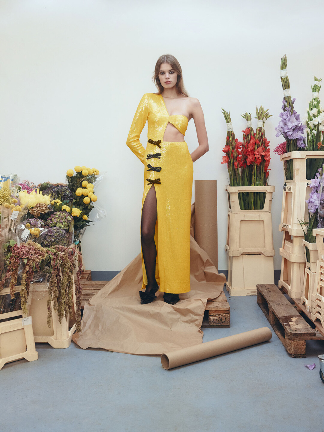 Самый весенний наряд — оранжевое платье из тафты от виртуоза прет-а-порте вечерки (и талантливой выпускницы лаборатории Славы Зайцева) Юлии Калманович, чьи вещи в мире носят Хейли Бибер, Леандра Медин и Кэти Перри, а дома — журналист Ксения Соловьева и фэшн-деятель Марина Голомаздина. Декольте платья украшено акцентными сборками и перламутровыми цветками из страз (flowers for spring!). Дофаминовая фэшн-альтернатива из весенне-летней коллекции бренда — салатовый топ-бандо с объемным рукавом и алое платье из тафты с гранд-бантом на поясе (на зависть Giambattista Valli и Carolina Herrera).