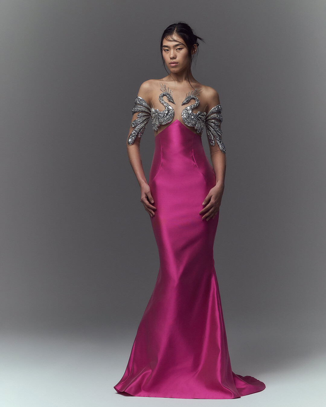 Самые богатые на декор вечерние платья — в кутюрных работах модного дома Yanina. За три десятилетия дизайнер Юлия Янина прошла путь от саратовского ателье до почетного места в расписании недели высокой моды в Париже и фэшн-дружбы с Джей Ло, Адрианой Скленариковой и Фань Бинбин. В весенней коллекции променяла привычный flowercore на черных лебедей из страз и перьев на силуэтных платьях, крылатых кейпах и приталенных жакетах.