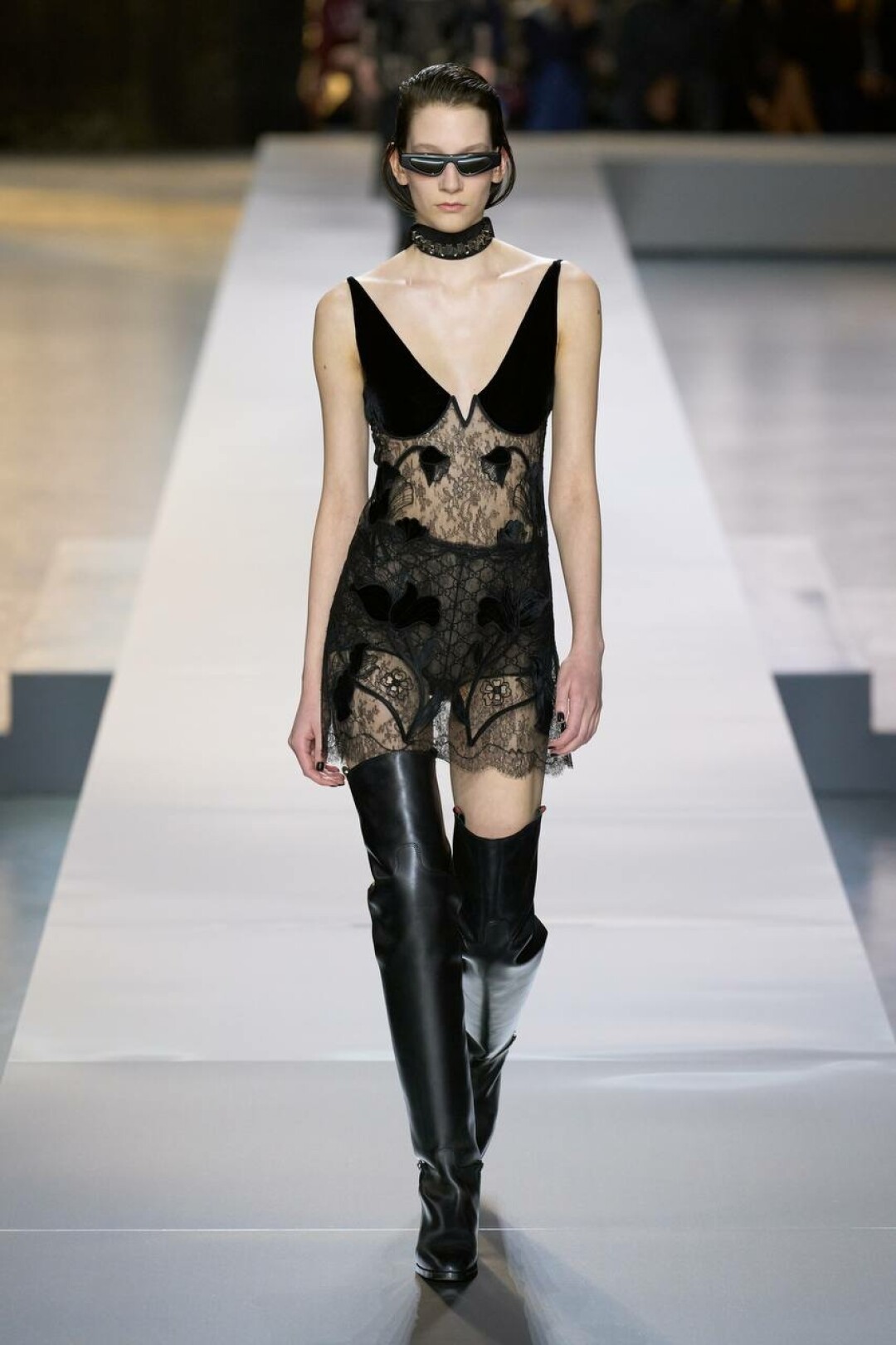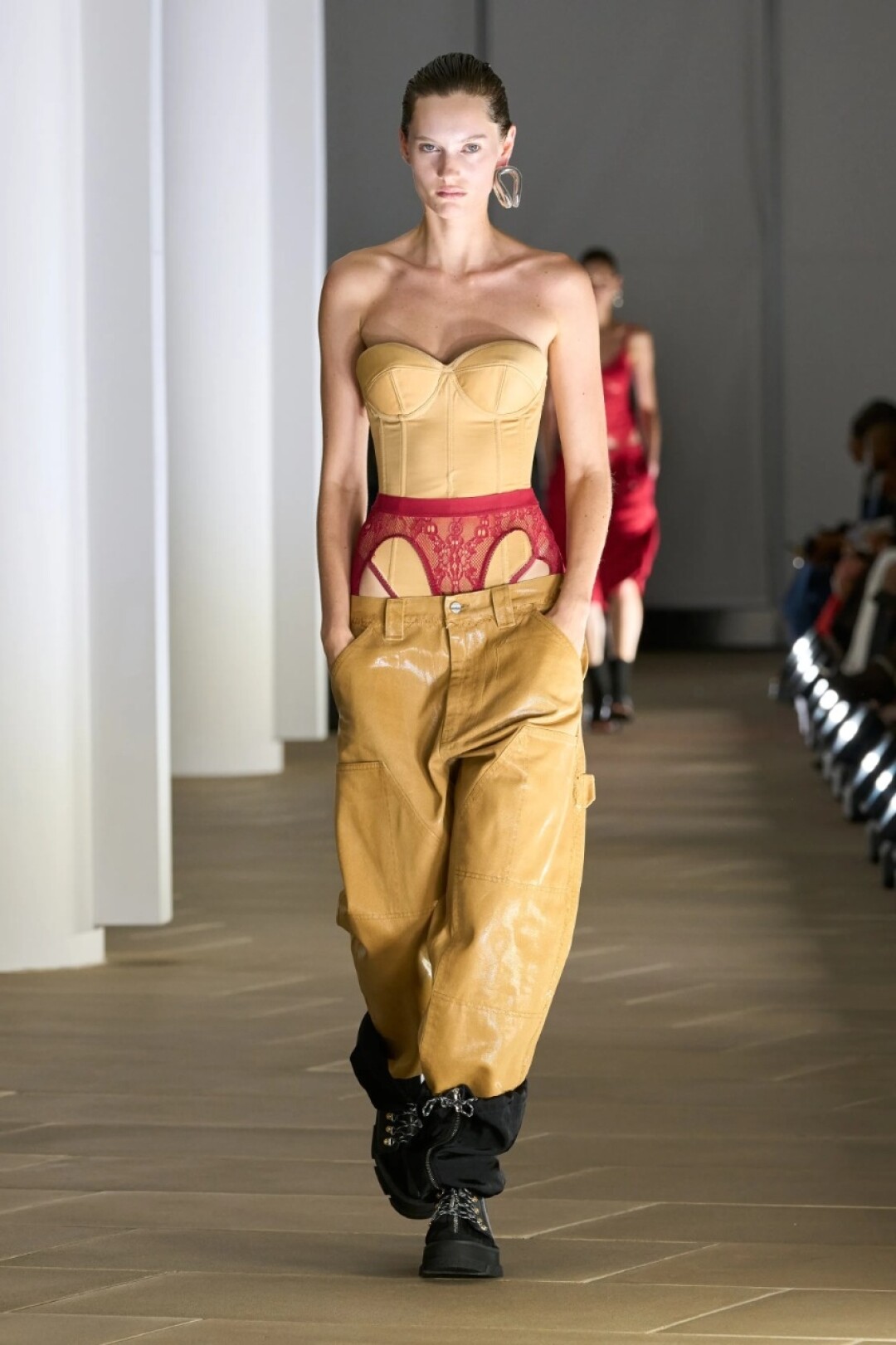 Расширяем функционал бельевого гардероба с помощью Coperni и Dion Lee: у первых подсматриваем подъюбник с кружевной отделкой в качестве полноценной юбки и сочетаем его с джемпером-паутинкой, а по примеру вторых достаем пояс для чулок прямо на корсет и выгуливаем с кожаными карго и ботинками рыбака.