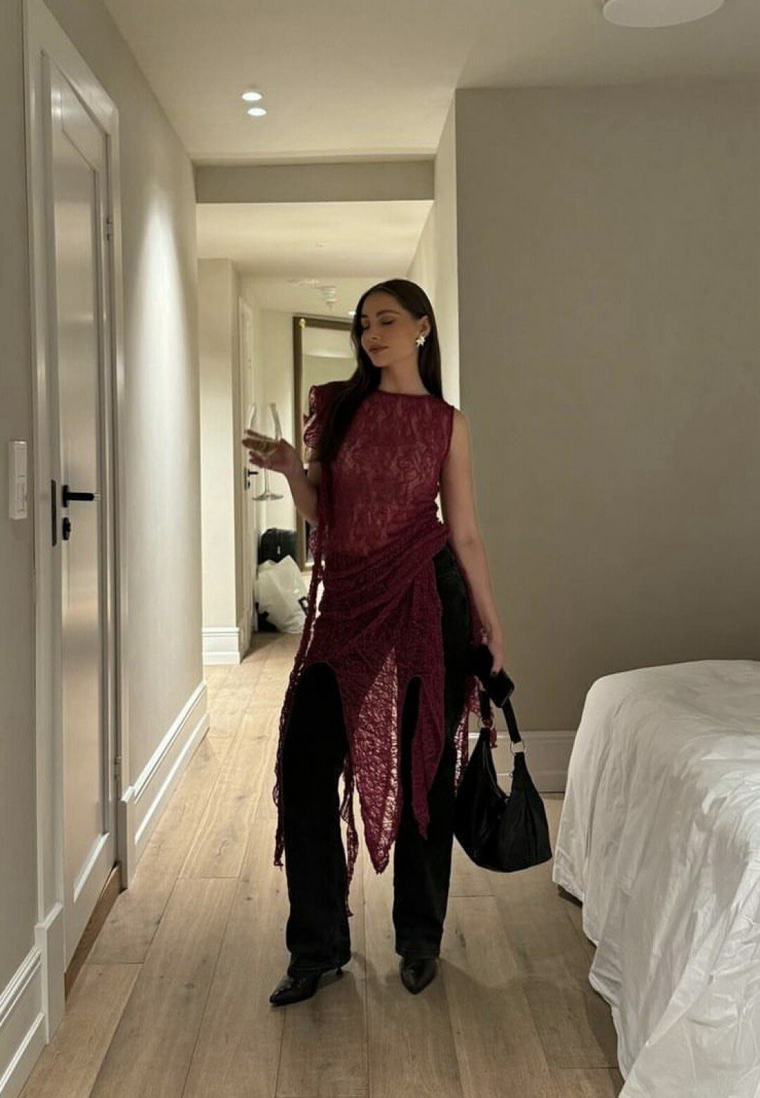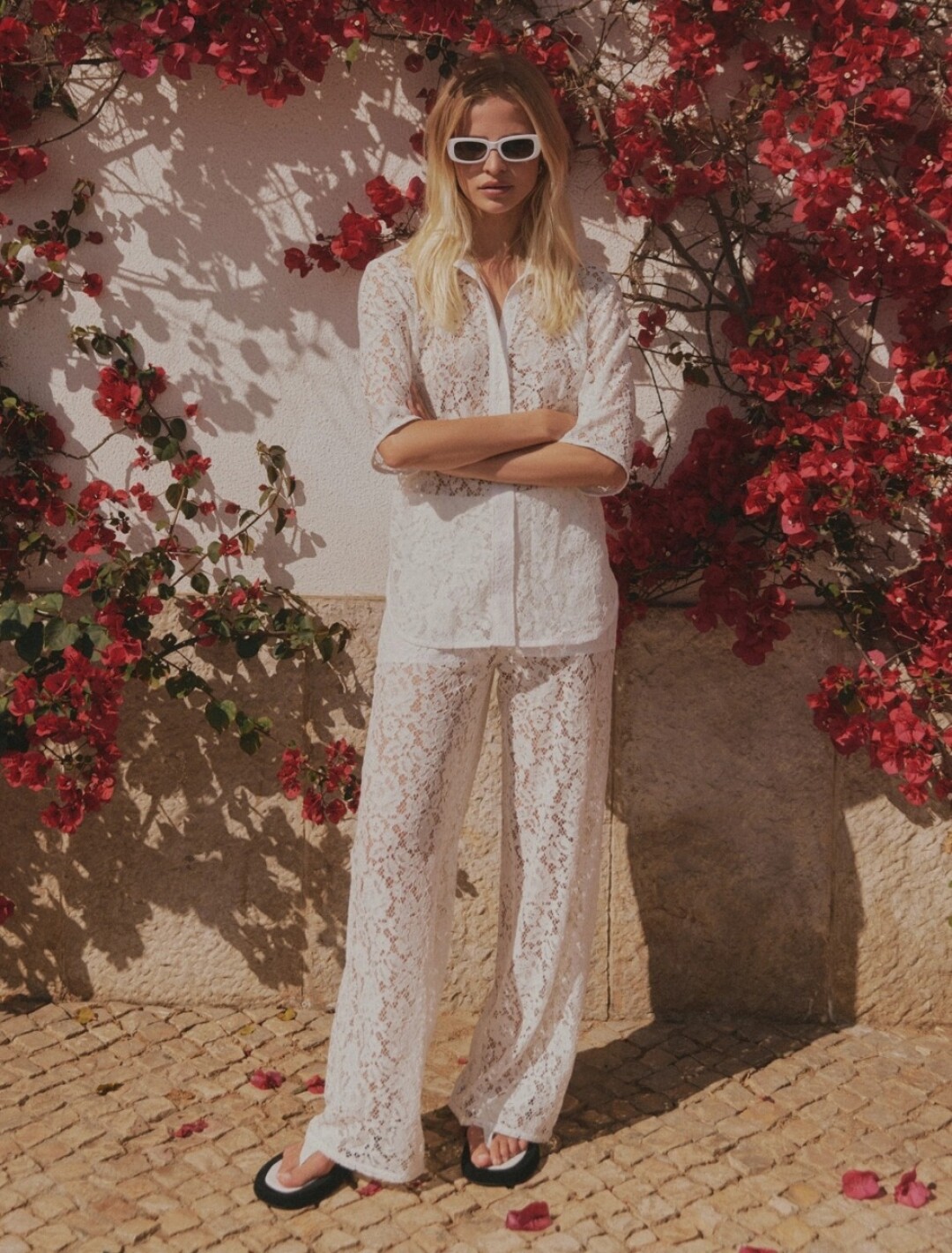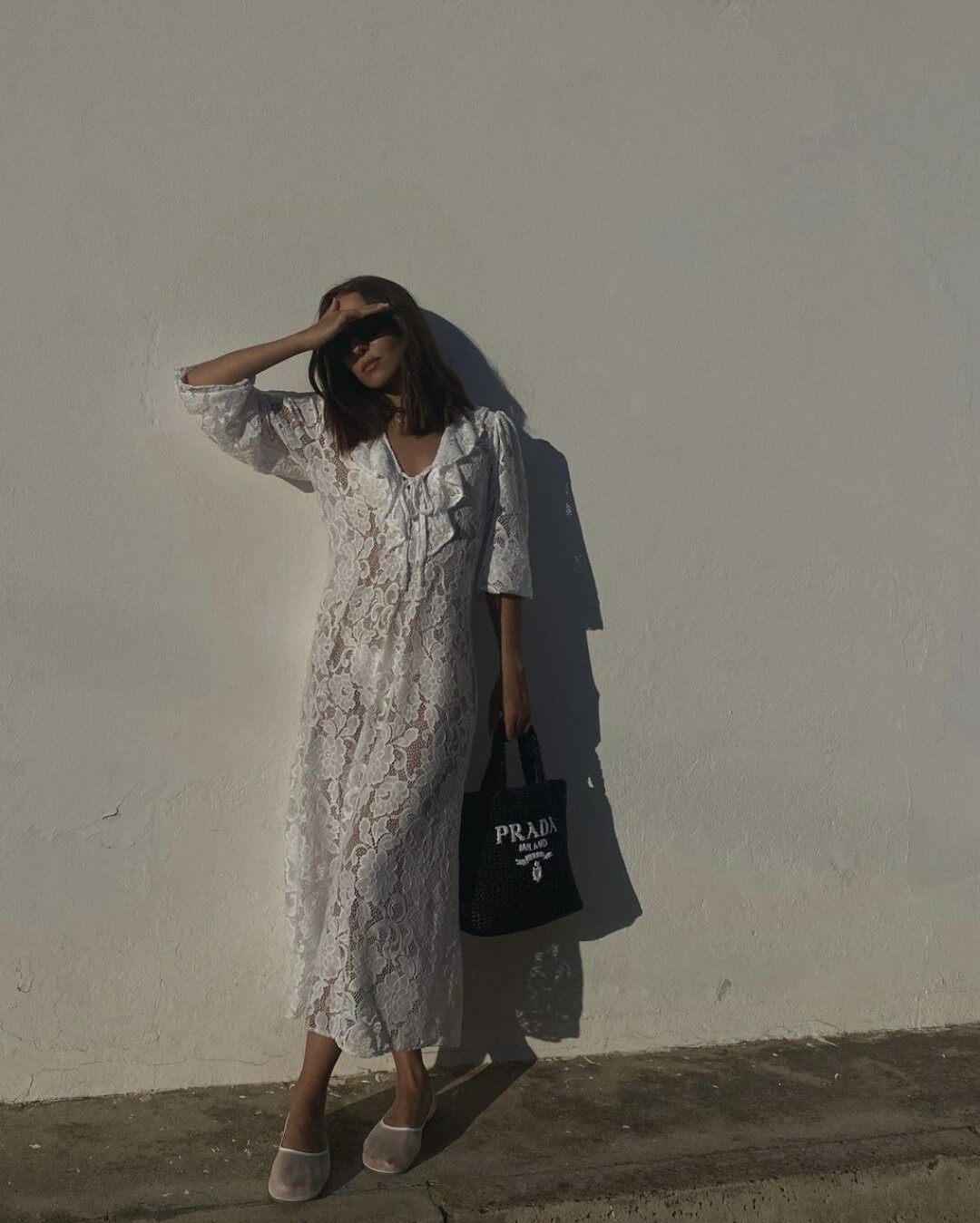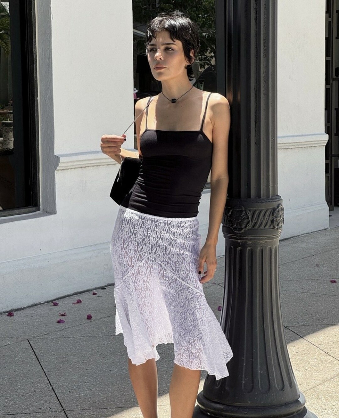 По примеру Жанны Дамас практикуем casual chic и миксуем ажурное боди с джинсами-буткатами и босоножками. Инфлюэнсер Мадлен Педерсен осваивает тренд платье + брюки, а дизайнер The Attico Джильда Амбросио — деконструктивизм и трансформирует комбинацию в юбку. Во главе с Джен Себаллос и Деборой Роса предчувствуем бум белого кружева и закупаемся ажурными юбками и платьями заранее.