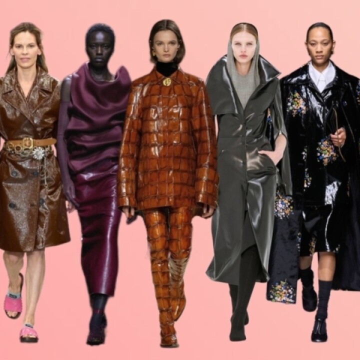 Зафиксировали еще один тренд кожи — вместо обычной теперь в почете лакированная, как у рептильных двоек Schiaparelli, сложносочиненных плащей Courreges и изумрудных платьев-тренчей JW Anderson.