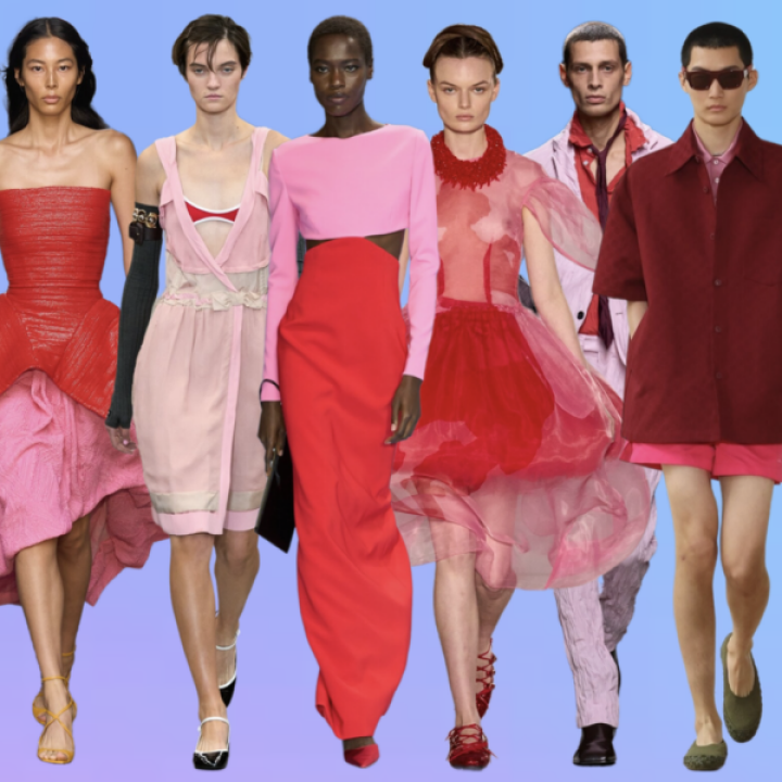 Оттачиваем искусство колорблока и по цветовому канону Miu Miu и Simone Rocha миксуем красный с розовым при помощи полупрозрачных slip skirt, жакетов-рюшей, нордических мунбутов и балетных пачек в авангардную панк-клеточку.