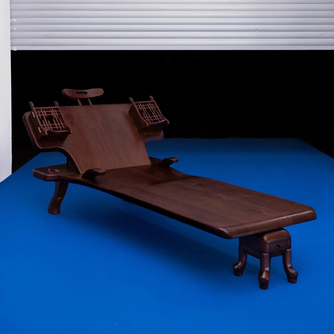 Пис юник! Мы знаем бренд Glumkimberly панк-авангардиста Богдана Высоцкого по полосатым лонгсливам и офискорным платьям в бантах (носит вау-стилист Лотта Волкова!). А вот главный дизайн-шоу- стоппер марки — дубовый шинуазри-шезлонг ручной работы.