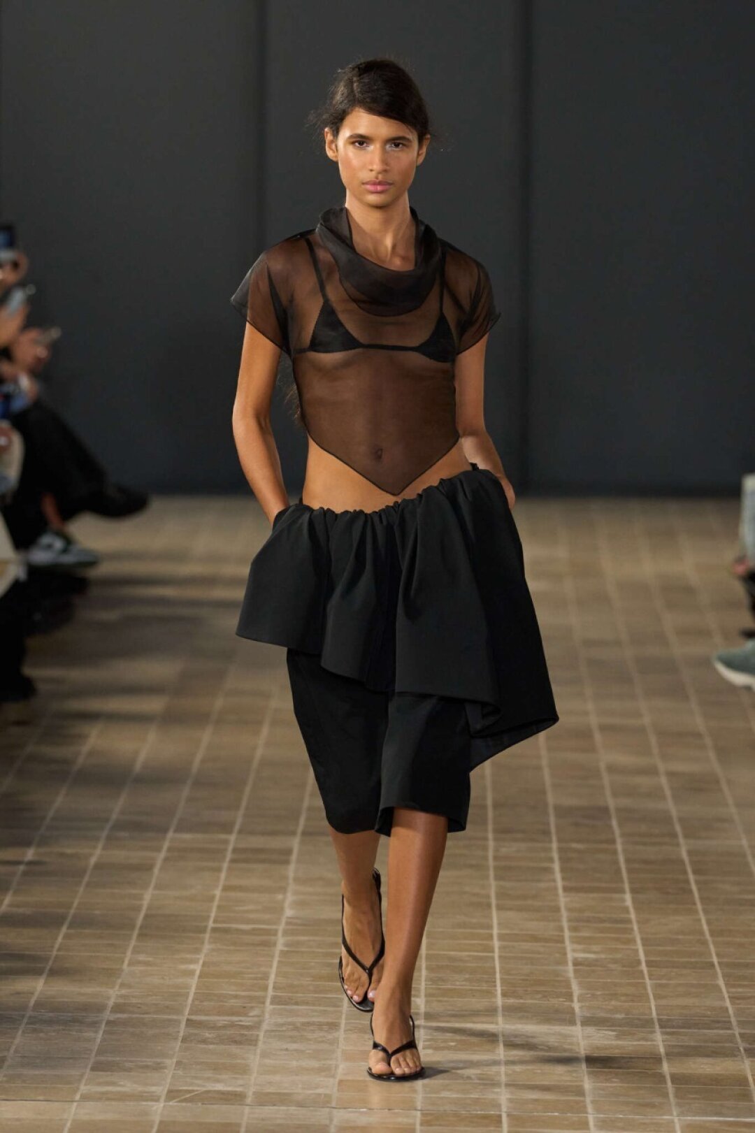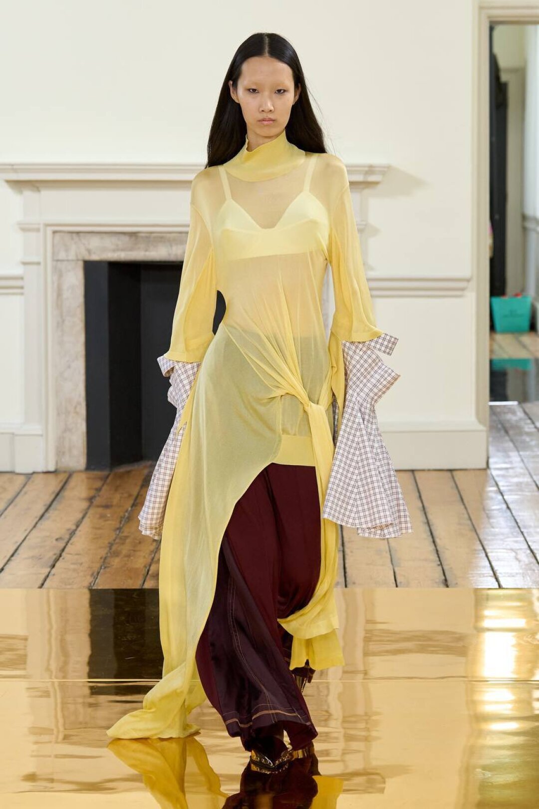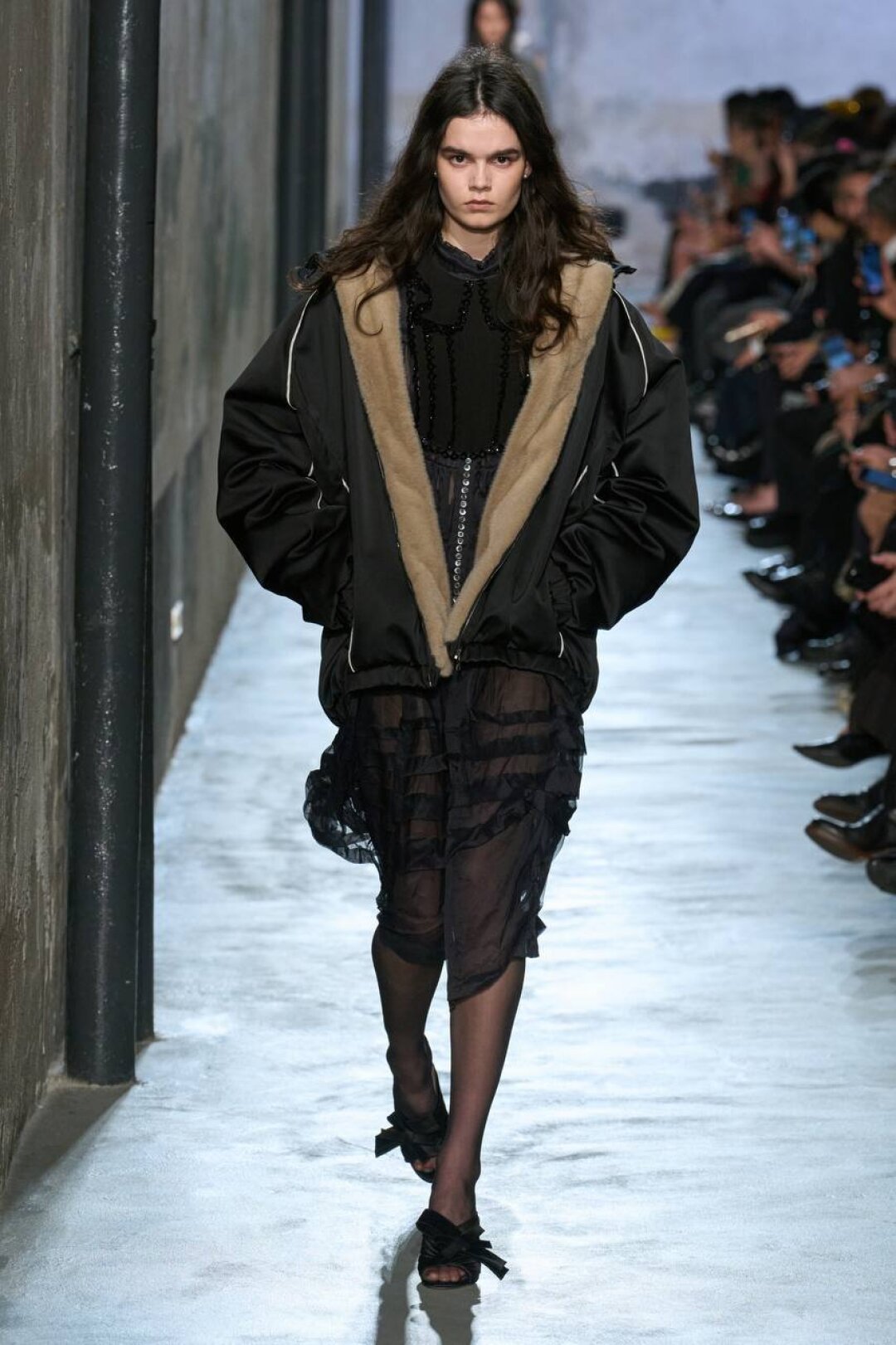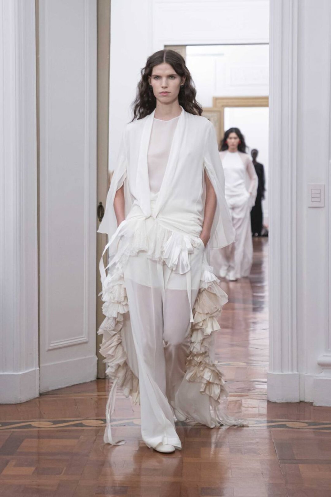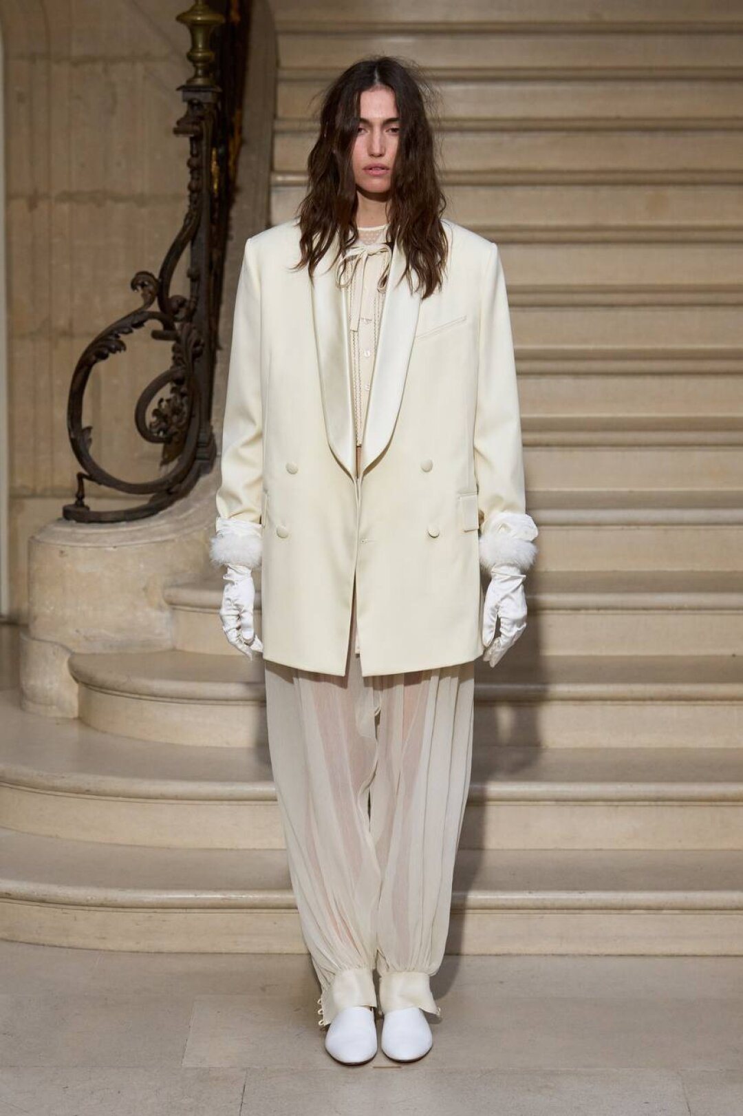 Комбо прозрачного низа и оверсайз-верха впервые засекли на фэшн-радарах после показа Saint Laurent FW'24 — Энтони Ваккарелло дополнил почти невидимые юбки-карандаши из тонкого трикотажа объемными шубами в оттенке черничного йогурта и плечистыми пальто в стиле power dressing. В этом году прием подхватили Altuzarra и Hodakova, которые предложили миксовать шифоновые юбки с массивной верхней одеждой — архитектурным пальто с пелериной или клошарским полутренчем. Жак Вей в бренде имени себя сделал ставку на кружево — надел лиловую миди в тандеме с кожаной рубашкой с питоновым принтом. А в Kenzo и Fendi отшили ультрамодные шаровары и прикрыли стратегически важные места с помощью маскулинных смокингов и удлиненных лонгсливов.