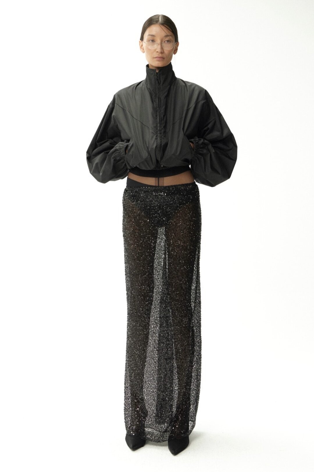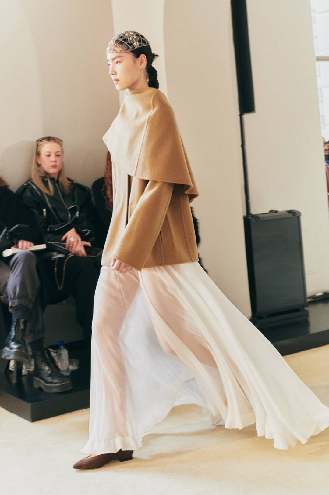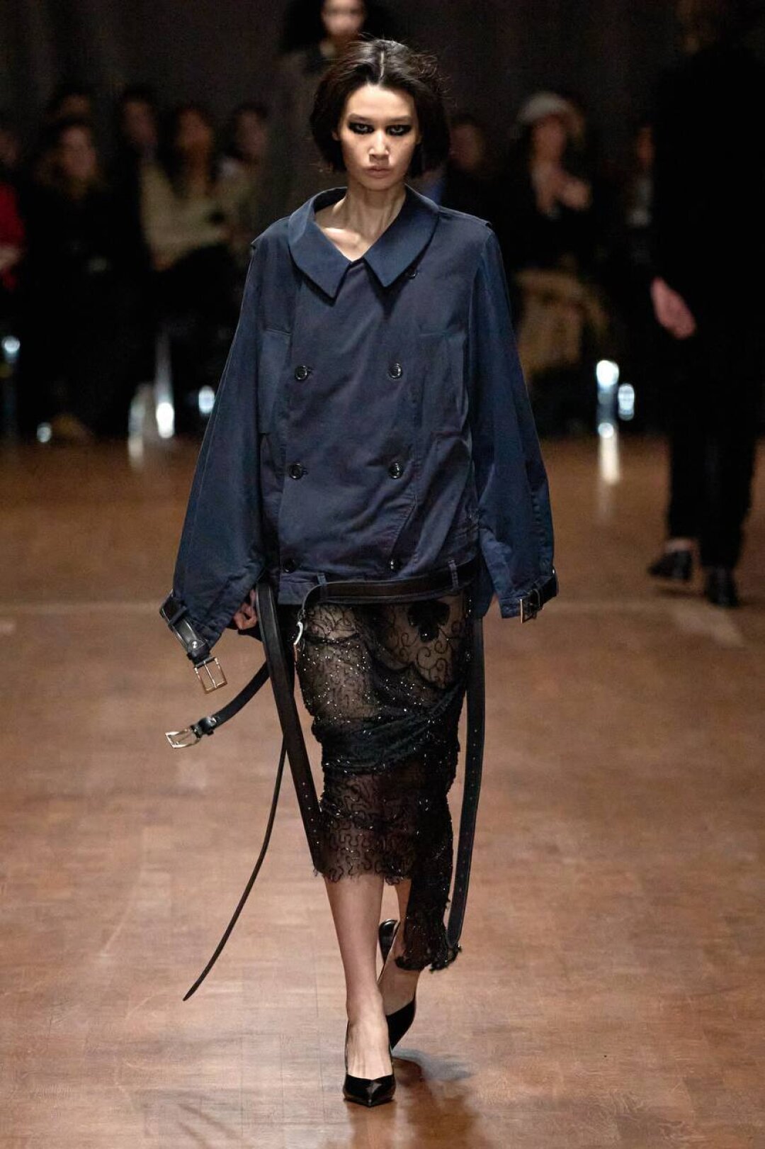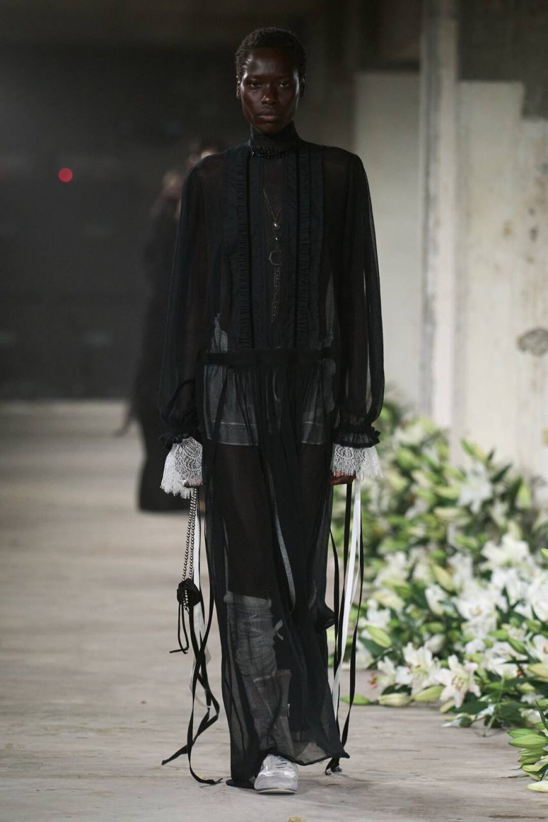 Комбо прозрачного низа и оверсайз-верха впервые засекли на фэшн-радарах после показа Saint Laurent FW'24 — Энтони Ваккарелло дополнил почти невидимые юбки-карандаши из тонкого трикотажа объемными шубами в оттенке черничного йогурта и плечистыми пальто в стиле power dressing. В этом году прием подхватили Altuzarra и Hodakova, которые предложили миксовать шифоновые юбки с массивной верхней одеждой — архитектурным пальто с пелериной или клошарским полутренчем. Жак Вей в бренде имени себя сделал ставку на кружево — надел лиловую миди в тандеме с кожаной рубашкой с питоновым принтом. А в Kenzo и Fendi отшили ультрамодные шаровары и прикрыли стратегически важные места с помощью маскулинных смокингов и удлиненных лонгсливов.