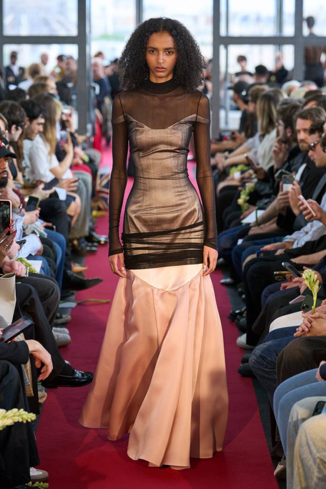 Запоминаем стайлинг-лайфхак для сурового петербургского апреля (+5 и дождь!): носим шифон и органзу в качестве дополнительного слоя. Миучча Прада утеплила прозрачное миди-платье хромакейным кэтсютом, а худрук Del Core Даниэль Дель Коре выдал офискорную базу — замиксовал рубашку-ромпер с призрачным футляром. Усложняем кэжуал-комбо джинсов и рубашки по примеру Гленна Мартенса из Diesel: дублируем первый слой сетчатыми айтемами, например, псевдовязаным сетом с косами. Забираем тренд в выпускные образы: по мотивам шоу Jacques Wei женим сложносочиненное платье из прозрачного шелка с базовой белой майкой, а при желании повторяем трюк с показа Burc Akyol и поверх классического prom dress надеваем приталенное миди из сетки.
