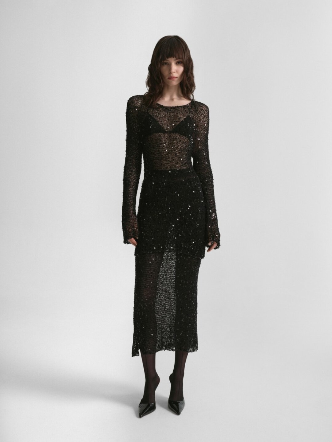 Если к total transparent вы пока не готовы, прощупайте почву с помощью вещей с прозрачными деталями: платьям с просвечивающим подолом, как показах Jil Sander и Coperni, нарядным шелковым макси с фигурными вставками с шоу Nina Ricci и Victoria Beckham. Или по совету Coach примерьте платье в стиле 20-х с асимметричной прозрачной деталью в тандеме с широкими бэгги-джинсами и инфантильными тапками-медвежатами.