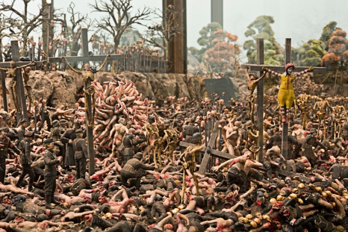 Что Так называемое антисоциальное искусство в рамках старинных техник — картин, гравюр и скульптур, правда с использованием стеклопластика. За подробное и любовное воссоздание кошмарных сцен — от интерпретации «Бедствий войны» Гойи в трехмерном пространстве с манекенами в человеческий рост до кукольной кровавой бойни в «Апокалипсисе сегодня» — получили прозвище главных извращенцев современной британской арт-сцены.