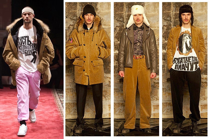 Еще один отечественный дизайнер, продвигающий на Запад образ дворового пацана, — Гоша Рубчинский. Герои его коллекций — не брутальные парни с цепями, а подростки из интернатов, типажи драмы Лукаса Мудиссона «Лиля навсегда». Они носят свитеры с косичками, водолазки не по размеру и спортивные костюмы. Два года назад Рубчинский начал сотрудничать с Comme des Garcons: Рэй Кавакубо и Эндриан Йоффе до сих пор помогают дизайнеру с производством и продажей коллекций. И если мы при виде треников и высоких носков с надписью «Рассвет» вспоминаем детство и пацанов с соседнего двора, то покупатели Dover Street Market, Opening Ceremony и 10 Corso Como просто скупают «детдомовскую» одежду, не задумываясь об ее происхождении.