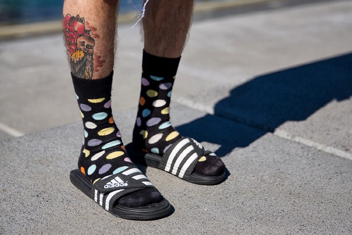 Пивной аромат, майка в сетку и закатанные штаны — популярный образ русского мужчины летом. Его лук всегда будут эпохально завершать сандалии, обутые на носки. Внезапно комбинацию «шлепки + носки» стало носить не зазорно, а наоборот, остромодно. Сначала Марк Джейкобс одел моделей Louis Vuitton в пастельные носочки, затем в них появились прилизанные мальчики Carven, после чего герои стрит-стайл блогов легализовали даже самые сумасшедшие варианты — например, носки в горошек с шлепками.