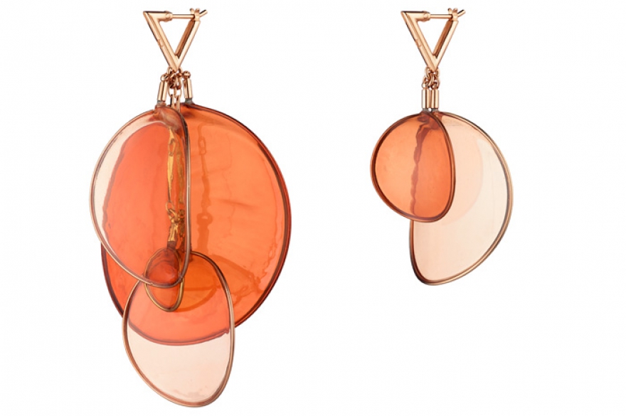 Серьги Louis Vuitton не зря выполнены в оранжевом или тускло-зеленом цвете — украшения имитируют чипсы. И они изящно смотрелись бы в пачке, если бы креативный директор марки Николя Гескьер не уготовил им другую судьбу: сочетаться со спортивными комбинезонами из летней коллекции. (Louis Vuitton)
