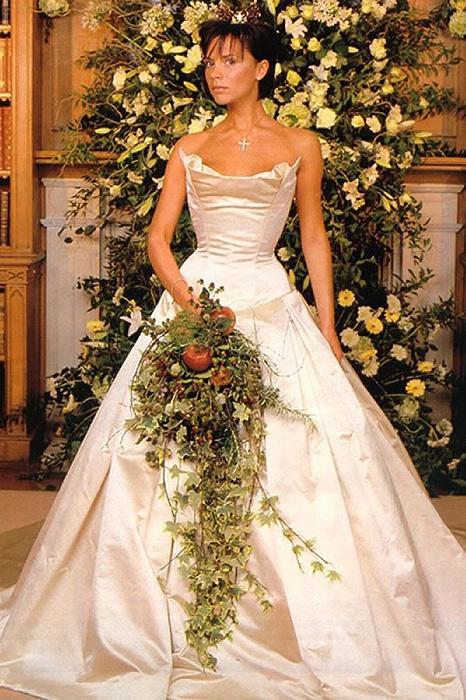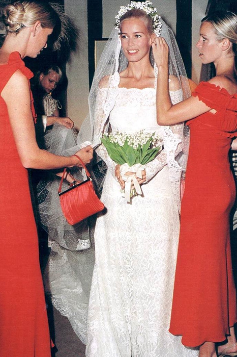 В восьмидесятые популярность безбашенных нарядов поутихла во многом благодаря королевской свадьбе принца Чарльза Уэльского и Дианы в 1981 году. Шлейф ее платья был около восьми метров в длину — и этот рекорд в Великобритании до сих пор никто не побил. Девяноcтые под венцом были ровно такие же, как и на подиуме, только без гранжа. Десятилетие минимализма принесло с собой лаконичные формы, простой крой и почти начисто истребило корсеты и пышные многослойные юбки-торты. Наглядной иллюстрацией стало простое жемчужно-серое платье Натальи Водяновой от Тома Форда, тогда еще креативного директора Gucci. Кстати, фату для свадебного образа супермодели придумала и сшила Татьяна Парфенова. Гламур, сопровождаемый модой миллениума, шел в ногу и со свадебными нарядами. Розовые платья (Гвен Стэфани, Джулианна Мур), россыпи страз (Дженнифер Лопес) и пачки в духе Кэрри Брэдшоу — вот дресс-код невест начала двухтысячных, который в отдельных регионах России существует до сих пор.
