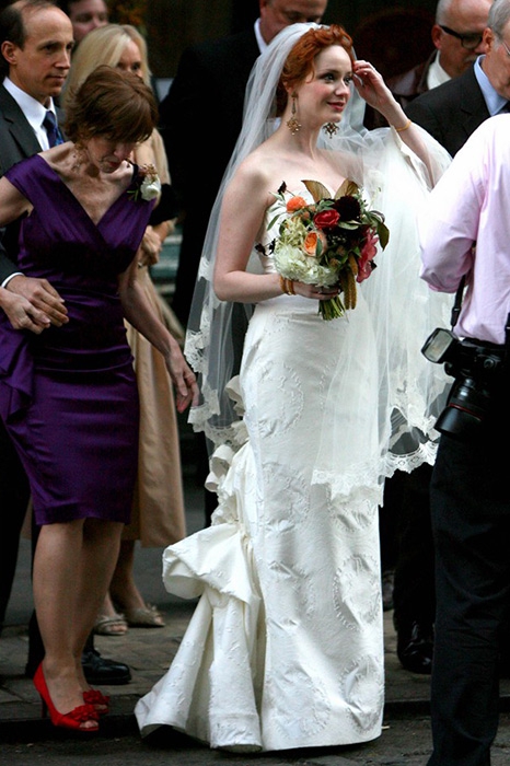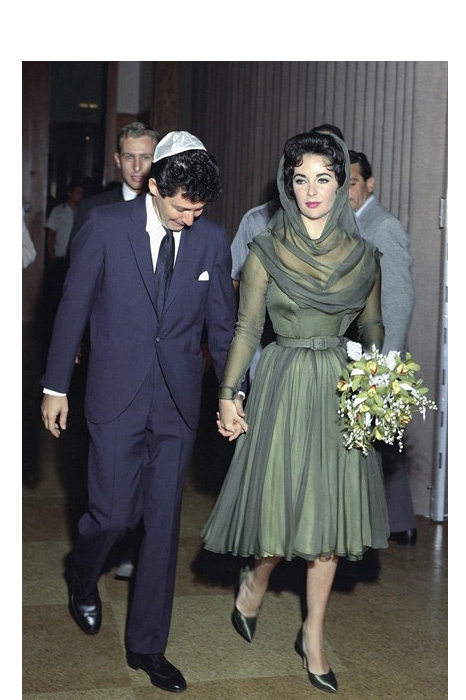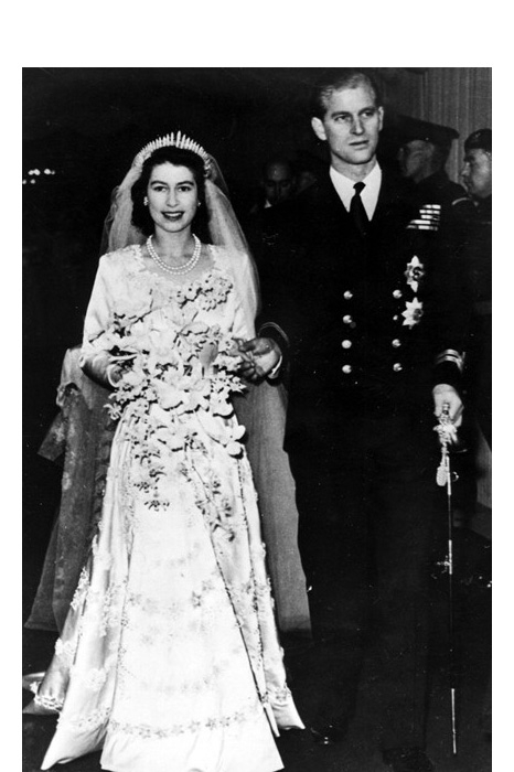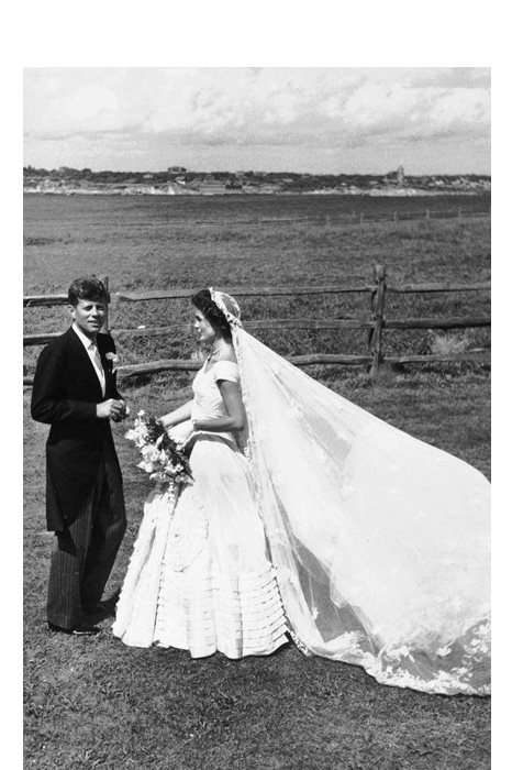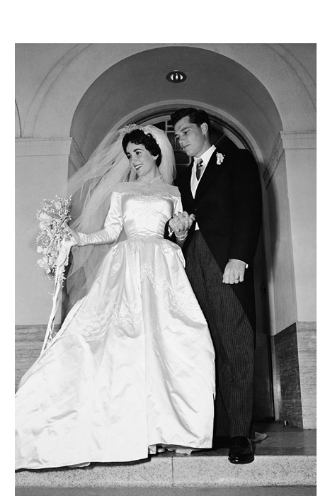 Хрестоматийным примером свадебного платья в летописи пятидесятых годов принято считать наряды Элизабет Тейлор, Грейс Келли и Елизаветы II. Одеть будущую королеву поручили официальному кутюрье семьи Норману Хартнеллу: в 1947 году модельеру пришлось обойти все лондонские музеи, вдохновляясь классической живописью. В итоге Хартнелл остановился на девушке с картины «Весна» Боттичелли в струящемся шелке, усыпанном аспарагусом, цветами жасмина и маленькими бутонами белых роз. Для его воплощения дизайнеру понадобилось более 10 000 жемчужин: во всей Англии столько не нашлось, поэтому королевская семья заказала недостающие в Америке. Свадебные тенденции в США задавала Жаклин Кеннеди: ее платье невесты было сшито из 45 метров шелка цвета слоновой кости и соответствовало всем трендам 1950-х — с глубоким декольте, лифом и пышной юбкой.