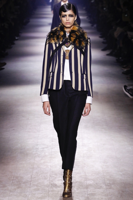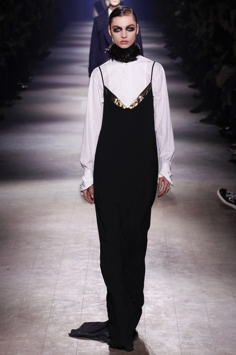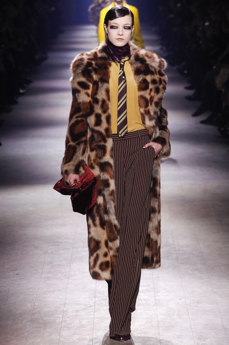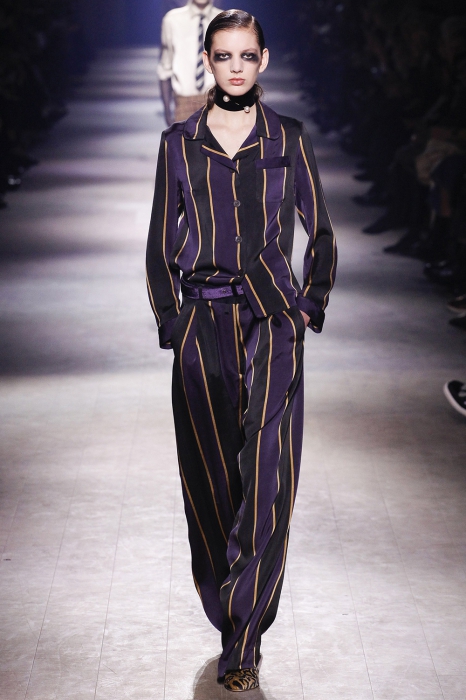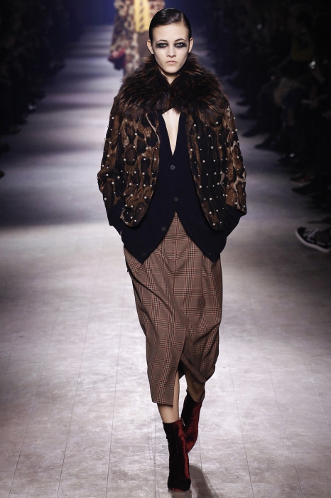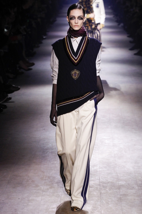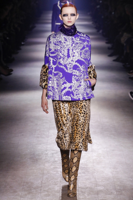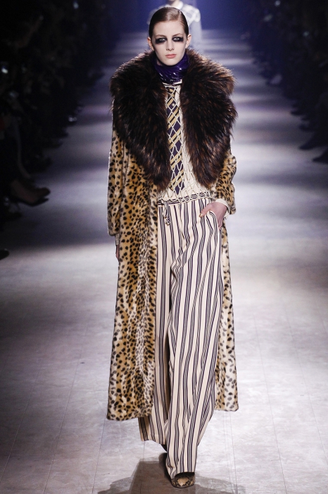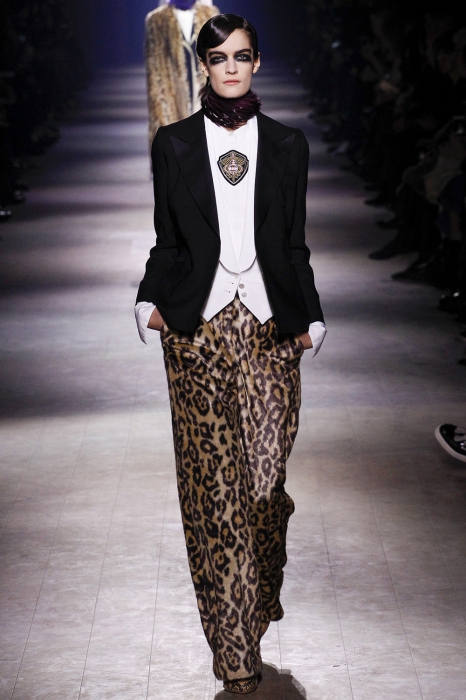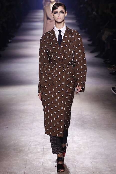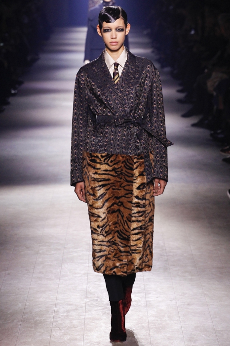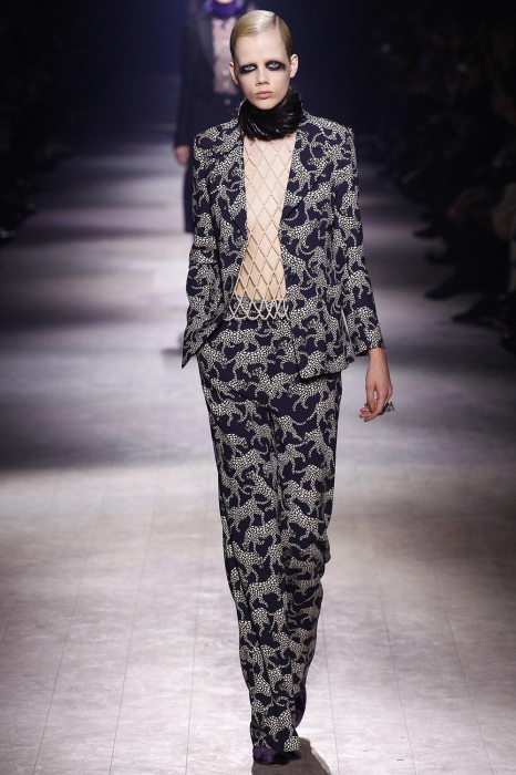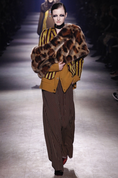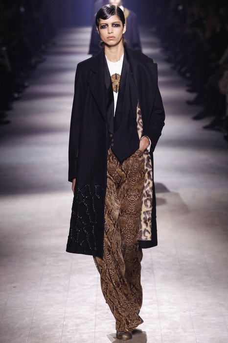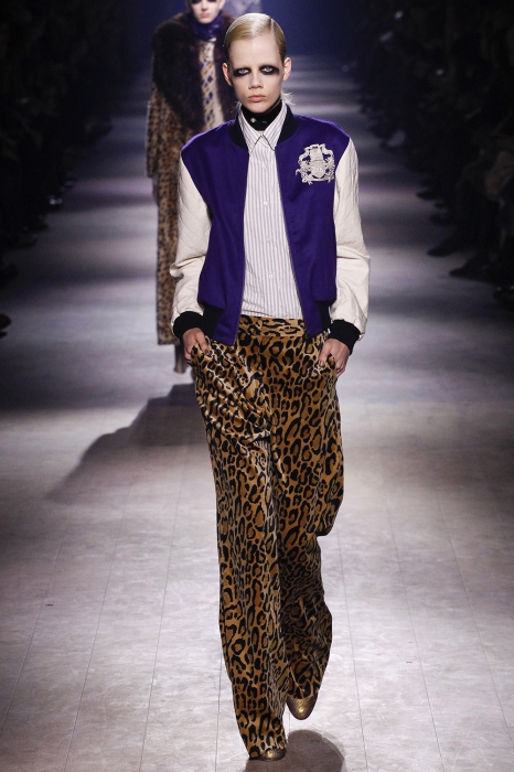 Уже по приглашению на показ, которое нарисовал инстаграм-художник Джилл Баттон, можно было понять, что коллекция посвящена маркизе Луизе Казати — музе поэтов и художников начала двадцатого века, подруге Дягилева, Пикассо и Поля Пуаре. Казати известна своим гедонистически-декадансным образом жизни: она собирала экзотических животных и выходила на прогулки со змеями и гепардами, носила босоножки на алмазных каблуках и называла себя живым произведением искусства. Именно благодаря ей в коллекции Дриса Ван Нотена появились меховые воротники, нити жемчуга на свитшотах, мужские галстуки и очень много леопарда (на пальто, бомберах, костюмах и рубашках).