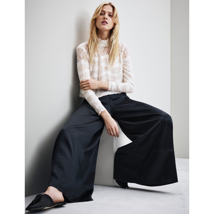 Кружево и деним — два главных слова весны, поэтому коллекция Gerard Darel строится на оттенках индиго и всех видах перфораций, а по силуэтам, как обычно, отсылает к 1970-м. Мы голосуем за сочетание клешей с полупрозрачным кружевным тренчем обязательного черного цвета. (Gerard Darel)