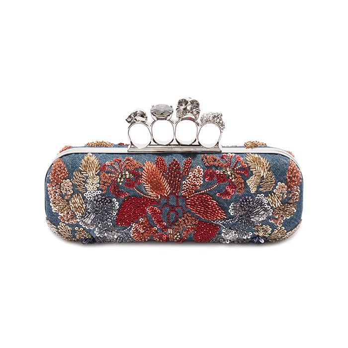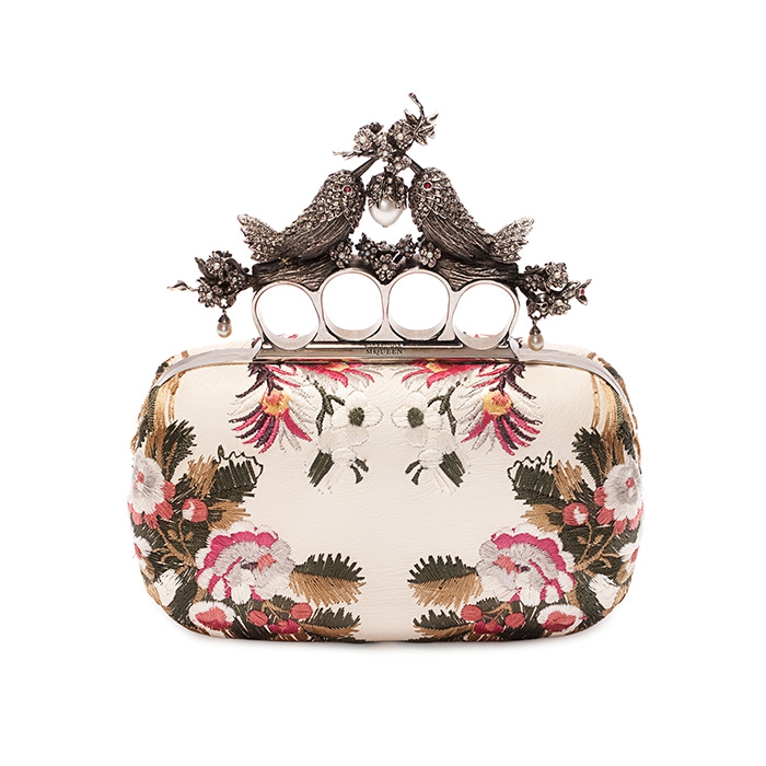 В ожидании открытия корнера Alexander McQueen в ДЛТ мы просто влюбились в клатчи-кастеты из весенне-летней коллекции. Яркая цветочная вышивка ручной работы и массивная застежка в виде заменивших традиционные черепа райских птиц делает их похожими на экспонаты Музея Виктории и Альберта, что неудивительно: креативный директор дома Сара Бертон вдохновлялась историей Англии времен династии Стюартов. (ДЛТ)