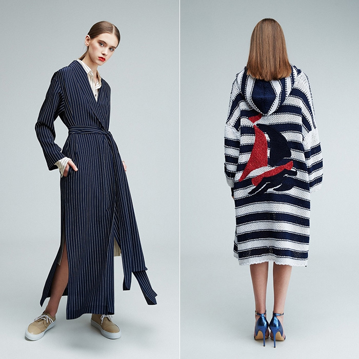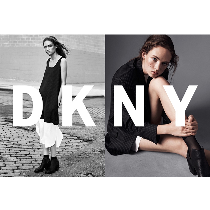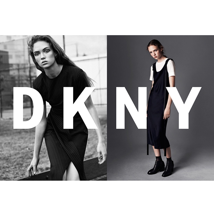 Американская марка держится урбанистичной установки: ничего лишнего, только черно-белая гамма, элементы мужского гардероба и убедительная полоска. Возврат к ДНК марки — минимализму — осуществили ее новые креативные директора Максвелл Осборн и Дао-И Чоу, кстати, прошлогодние победители важнейшей американской премии CFDA/Vogue Fashion Fund в номинации «Лучшие молодые дизайнеры». (DKNY)