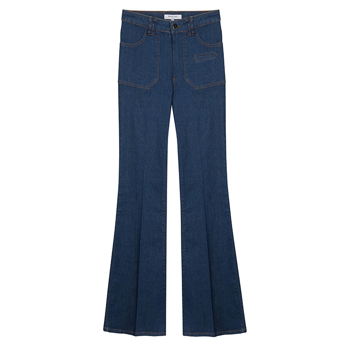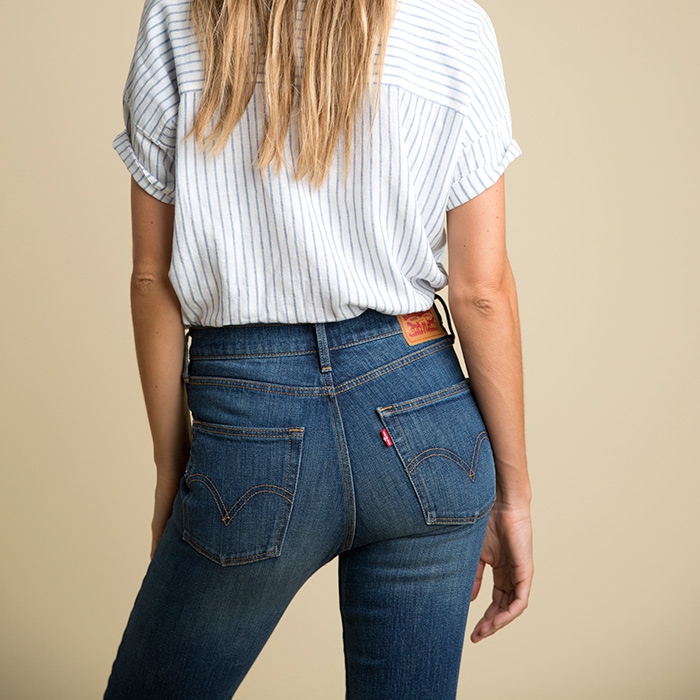 Модель — премьера линии Wedgie — так же, как и ее предшественники, имеет завышенную талию, но отличается другим акцентным решением в посадке на бедрах. Она не только стала более плотной, но и обзавелась сужающейся линией задних карманов, что визуально добавляет объем, прямо как у красавиц с винтажных пинап-открыток. (Levi’s)