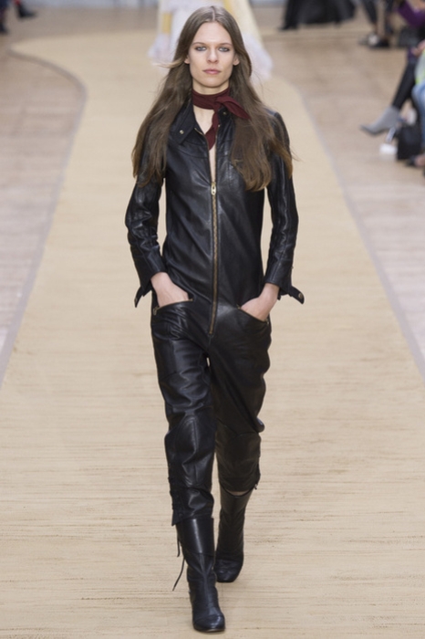 Судя по последним коллекциям, мода на комбинезоны продолжится и в осенне-зимнем сезоне. В центре мудборда Chloe — Анна-Франц Дутевилль, которая в семидесятых в одиночку объехала Средний восток на мотоцикле. Поэтому в коллекции Клэр Уэйт Келлер появились мотоциклетные комбинезоны из кожи. Точно такие же, но в красном цвете, показали Acne. Wanda Nylon цитируют карбоновый комбинезон рабочих, а A.P.C. экспериментируют с гимнастическим.