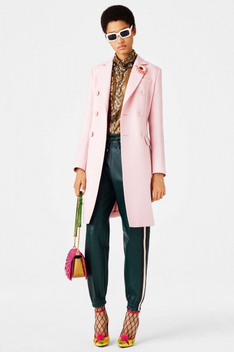 Чтобы не получилось слишком спортивно (спортивный костюм в этом сезоне — скорее одежда для вечеринок, чем для стадиона), накидываем поверх розовое пальто, как у Bally, и не боимся высоких каблуков и чулок в сетку.