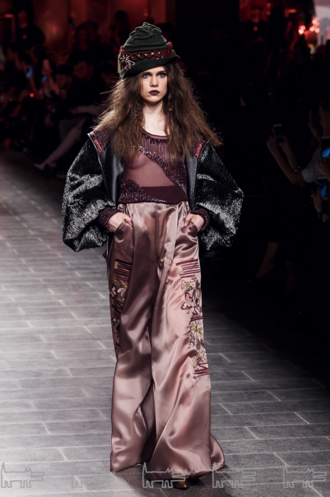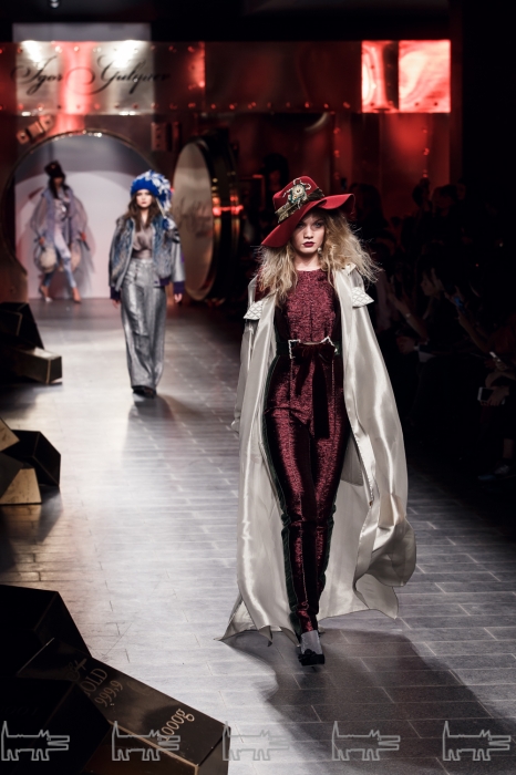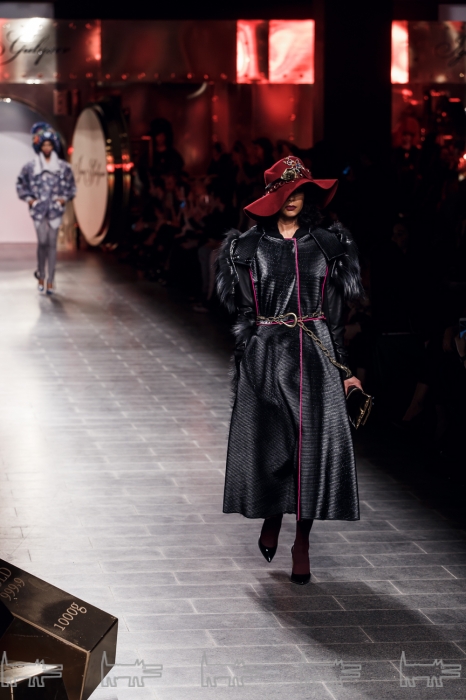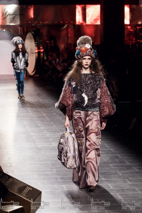 Показ осенне-зимней коллекции «Высшая проба» больше напоминал театрализованное представление: около сотни луков подружили между собой золото и цветной мех, кожаные «косухи» и вязаные кардиганы, плюшевые рюкзаки с нашивками и лакированные чемоданы с надписью «КЭШ» и другие. Гуляев предлагает сочетать макси-платья со шляпами-котелками и цилиндрами, носить костюмы золотого и серебряного оттенка, если меха — обязательно цветной с символикой дизайнера.
