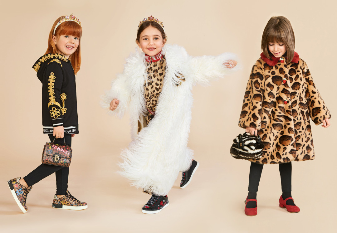 Даешь детскую моду! С таким лозунгом Доменико Дольче и Стефано Габбана выпустили лукбук, в котором соблюдены все взрослые тренды: леопард, цветы и логомания. Родители могут спать спокойно: одежда выполнена из качественных материалов, кроссовки — из кожи, шуба — из экомеха и шкуры кролика, а футболки и платья – из хлопка. В детских образах аксессуары последних коллекций Dolce & Gabbana смотрятся органично: ободки с коронами, рюкзаки из плюша в виде животных, сумки с крупными надписями и вышивкой, обилие цвета и принтов. Есть и вариант новогоднего подарка от бренда: коллекционный набор игрушек DGFamily, где Доменико и Стефано в окружении домашних животных.