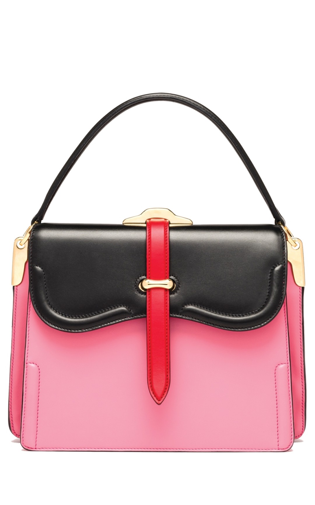 Как бы ни пытались новые it-bags прикинуться олдскулом, ничего у них не получается. В Prada хоть и взяли классическую форму сумочки времен индустриальной революции в Милане, но раскрасили ее в самый крутой колорблок сезона. Розовый и алый с брутальной черной вставкой и золотой фурнитурой — наш объект желания. (Prada)