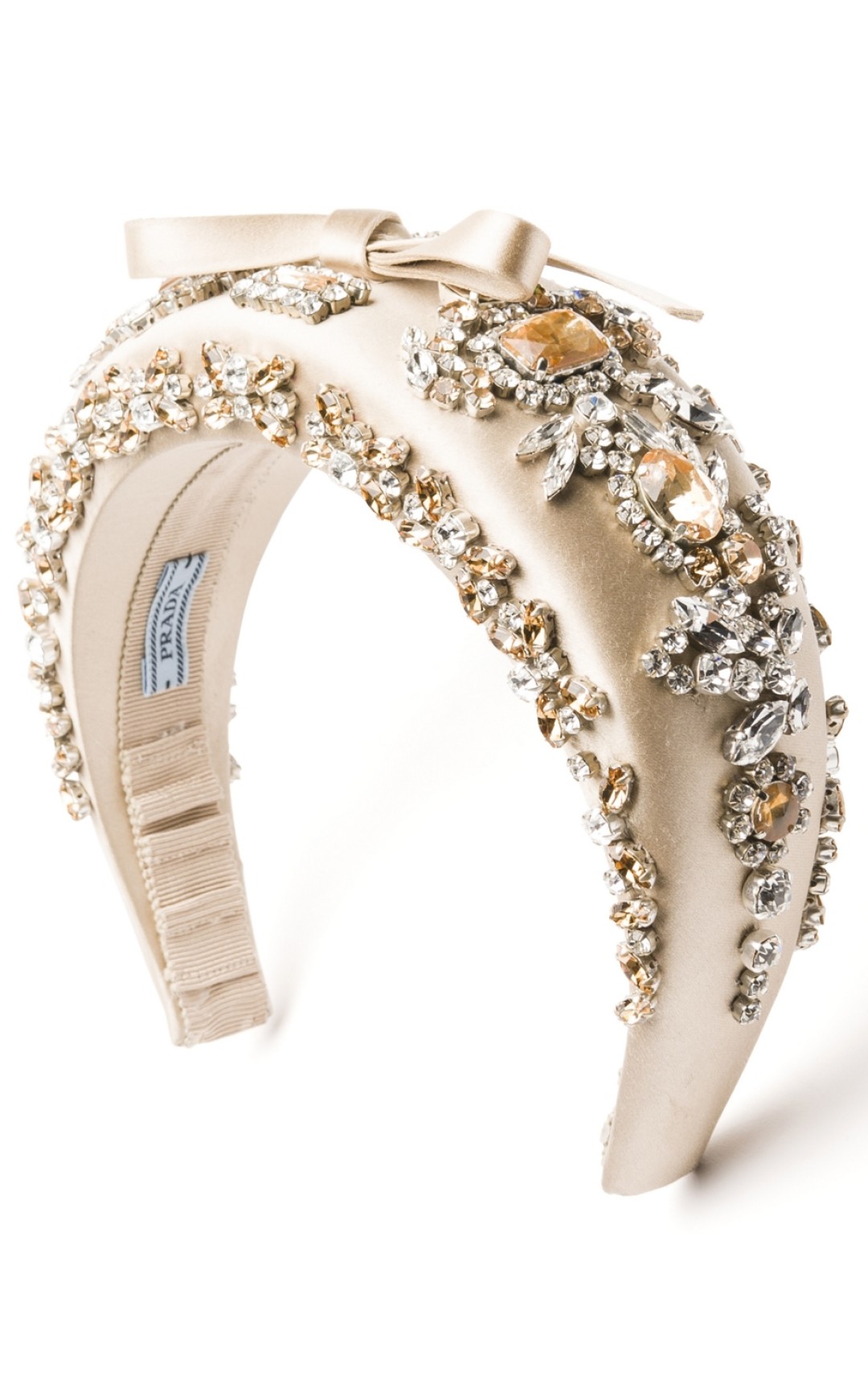 Широкие ободки Prada — самый узнаваемый аксессуар нового сезона — будем носить вместо гигантских шляп. Из калейдоскопа цветов — желтого, красного, сиреневого — выбираем бледно-розовый, усыпанный нескромными стразами и увенчанный бантом. (Prada)