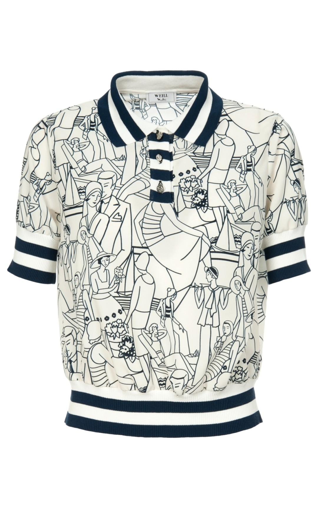 Принт со сценами из манерной пляжной жизни начала ХХ века на трикотажном поло Weill посвящен курортному Довилю. Креативный директор Матильда Кастелло Бранко украсила собственной графикой в манере Жана Кокто блузу с полосками нормандской тельняшки. (Weill)