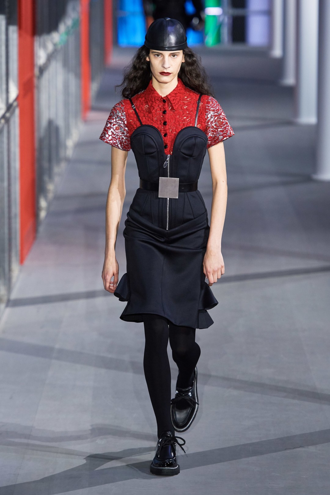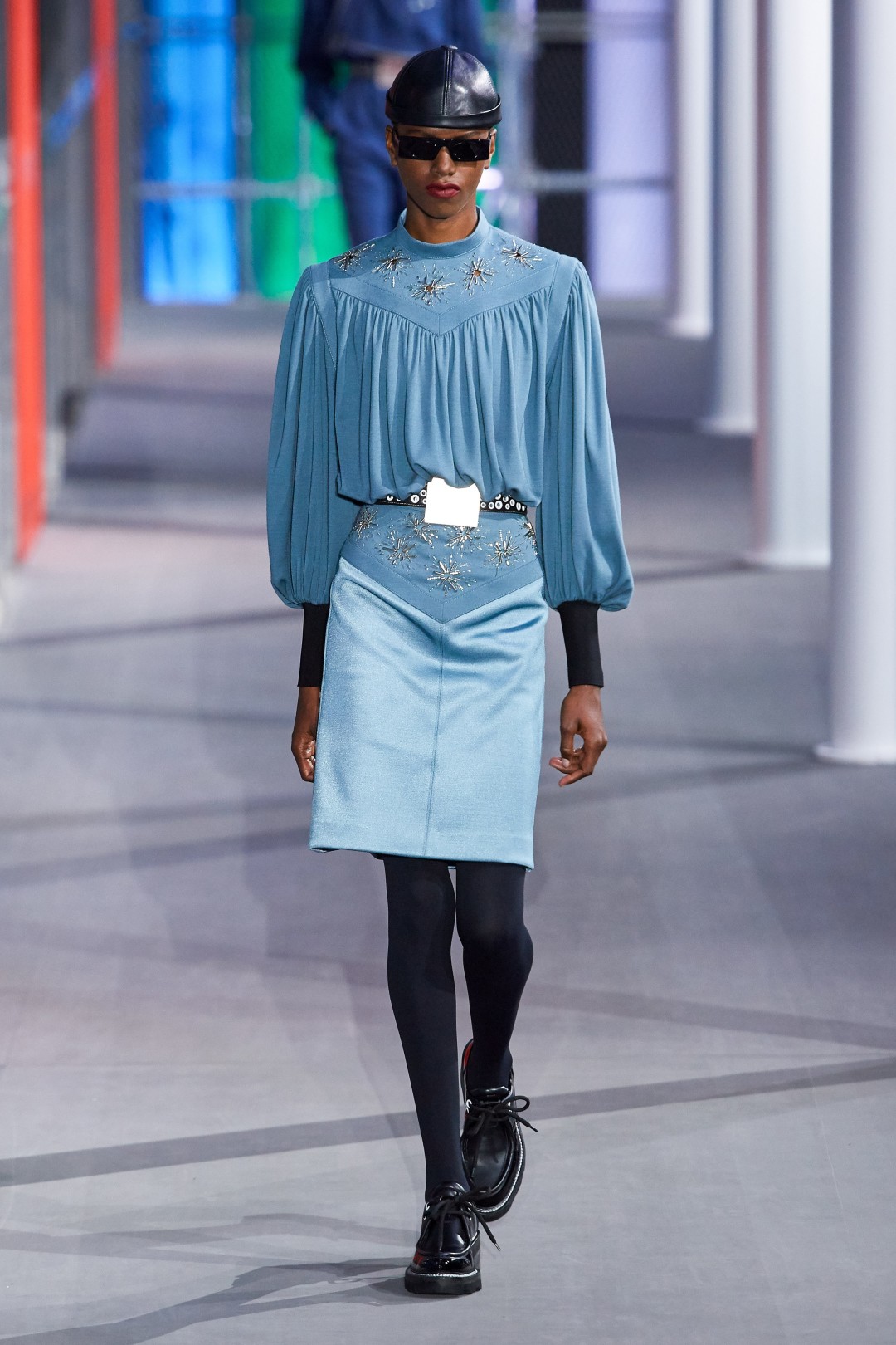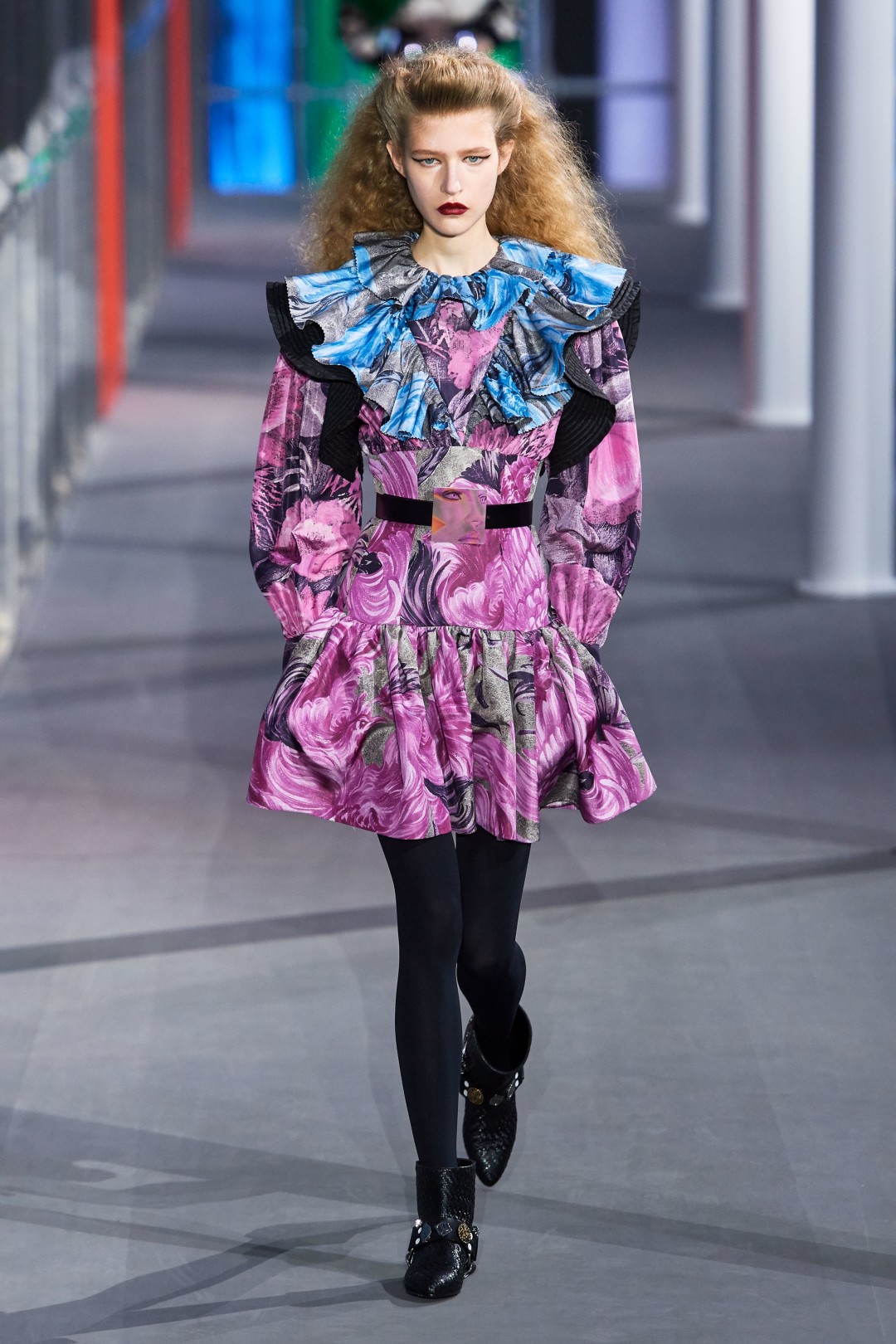 За основу коллекции Николя Гескьер взял восьмидесятые, наложенные на его фирменный футуристичный лад: платья с гипертрофированными плечами дополнены воланами, брюки с завышенной талией сделаны из синего денима, а оверсайзовые романтичные блузы выполнены из ситца. Но главное, за чем будут охотиться поклонницы Louis Vuitton в следующем сезоне, — платья с корсетами, украшенные звездами, тулупы-безрукавки, апеллирующие к кантри дресс-коду, и архитектурные куртки с принтами, повторяющие антураж Центра Помпиду.