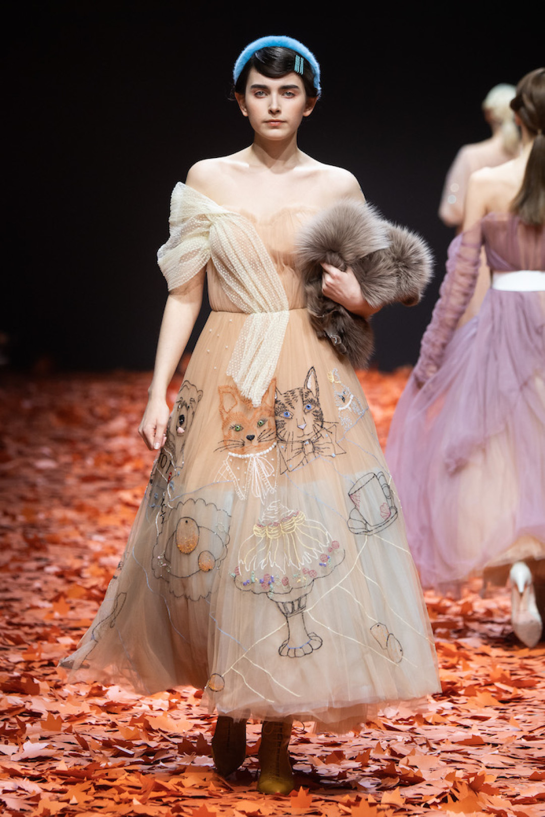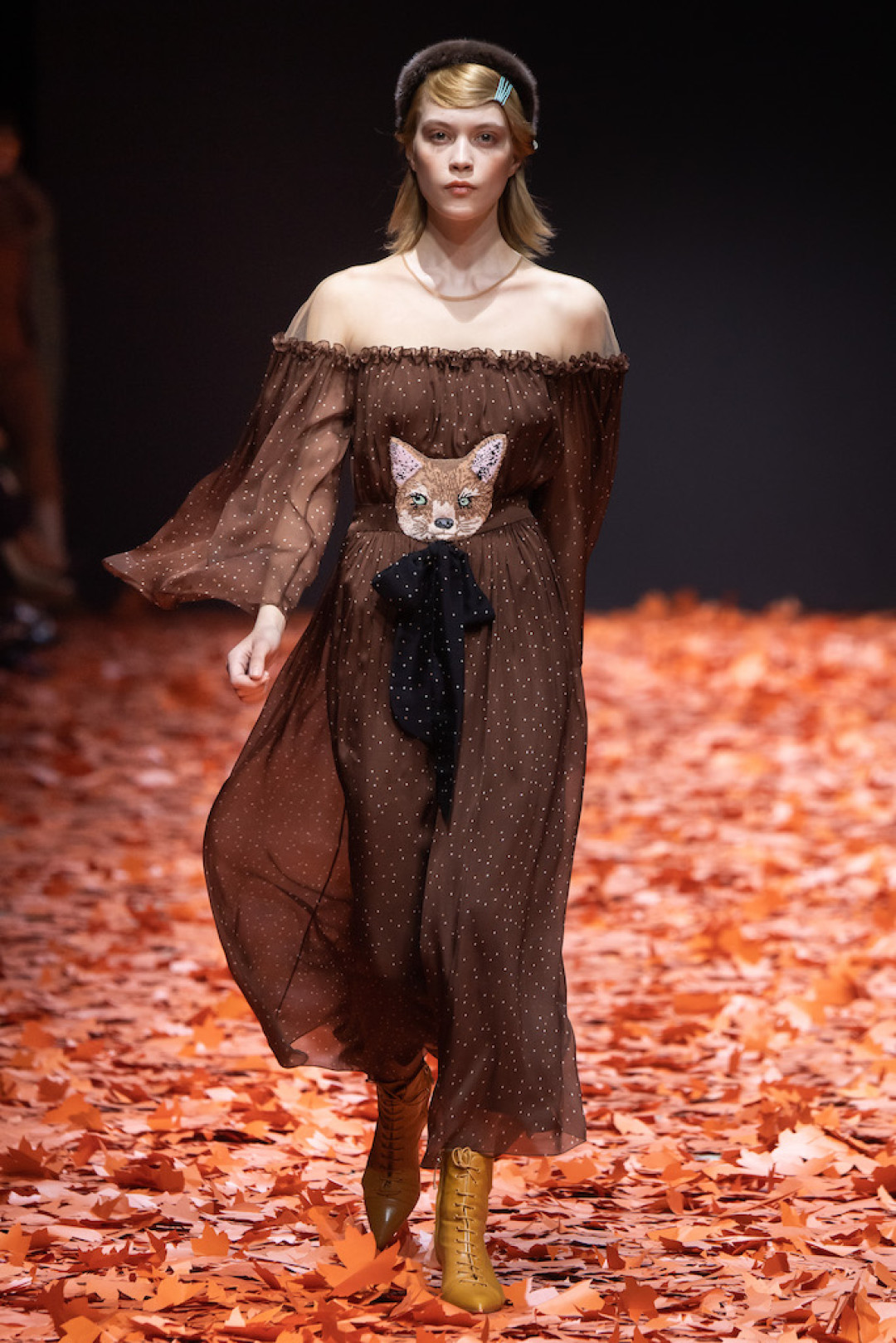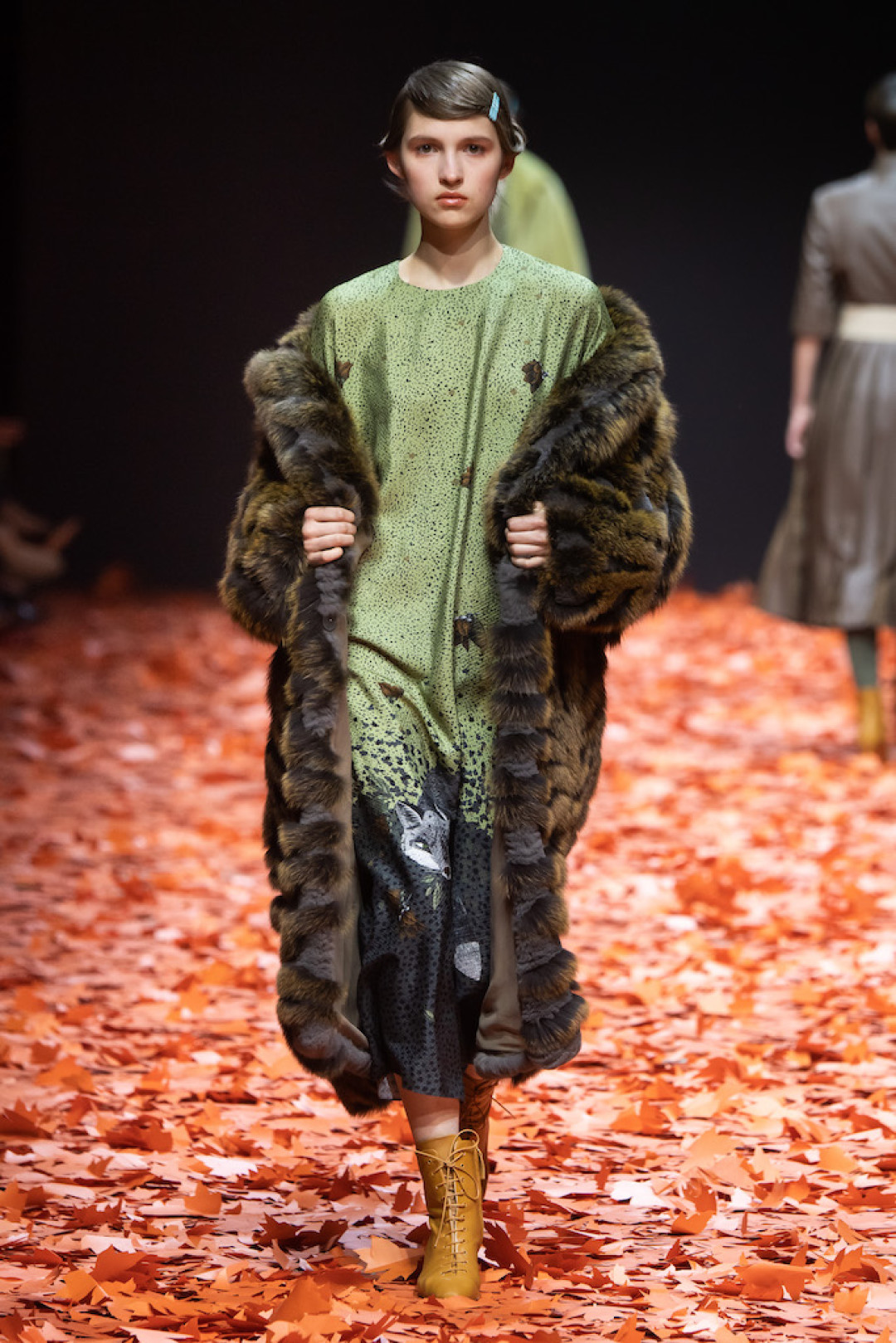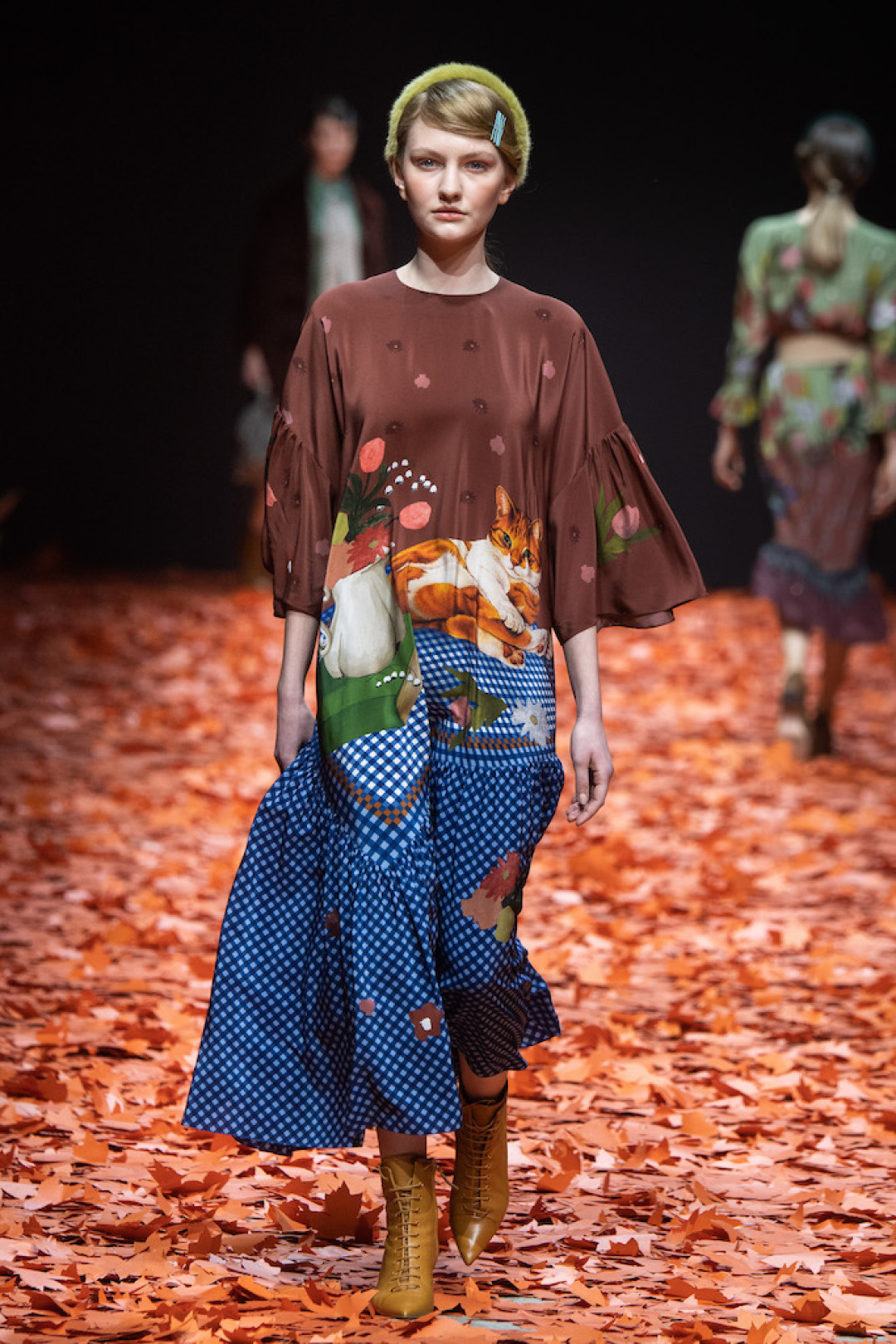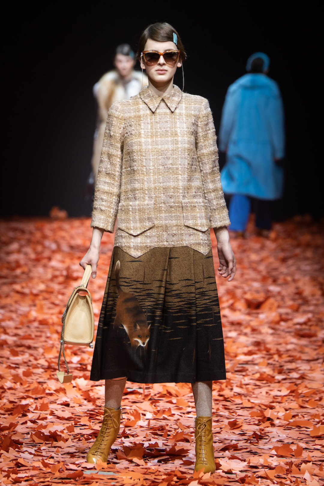 Алена Ахмадуллина показала осенне-зимнюю коллекцию в Музее Москвы в рамках Mercedes-Benz Fashion Week Russia. На платья, пальто, сумки и шубы, сделанные в стилистике 1950-1970-х годов, дизайнер из Петербурга переложила мотив сказки «Кот и Лиса». Лиса появляется в виде купонного принта на нарядах А-силуэта, а кот — в виде вышивки бисером на кутюрных моделях из вечерней линейки.